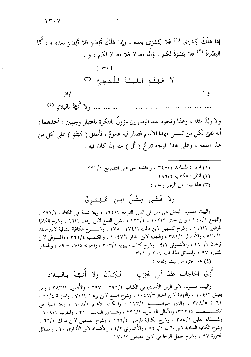 ولا زيد مثله، وهذا ونحوه عند البصريين مؤول بالنكرة باعتبار وجهين: أحدهما: أنه نفي لكل من تسمى بهذا الاسم فصار فيه عموم، فأطلق (هيثم) على كل من هذا اسمه، وعلى هذا الوجه تنزع (أل) منه إن كان فيه.