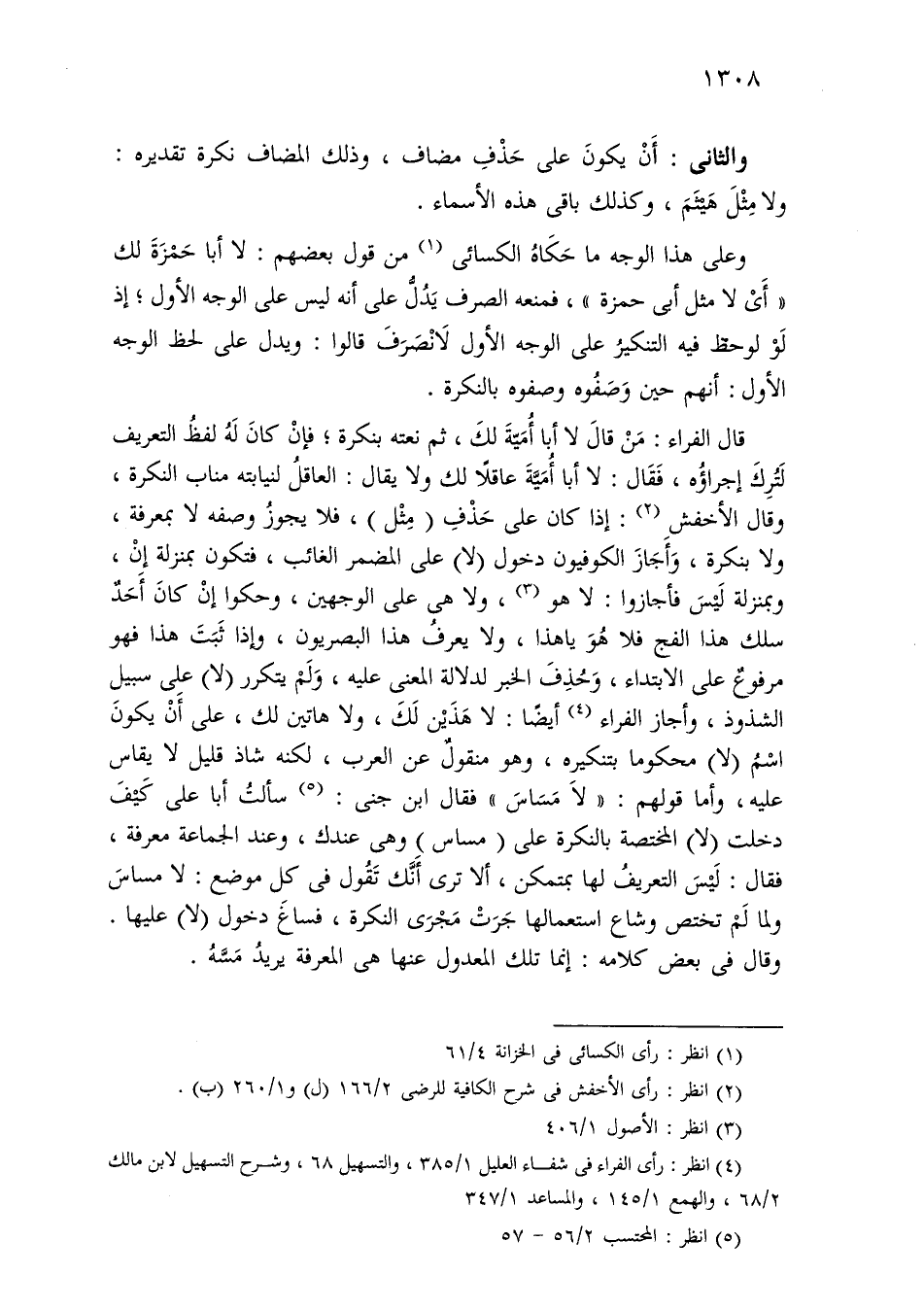 وعلى هذا الوجه ما حكاه الكسائي من قول بعضهم: لا أبا حمزة لك «أي لا مثل أبي حمزة»، فمنعه الصرف يدل على أنه ليس على الوجه الأول؛ إذ لو لوحظ فيه التنكير على الوجه الأول لانصرف قالوا: ويدل على لحظ الوجه الأول: أنهم حين وصفوه وصفوه بالنكرة.