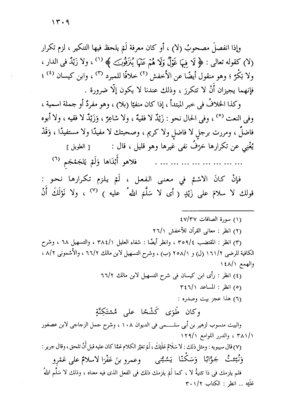 وإذا انفصل مصحوب (لا)، أو كان معرفة لم يلحظ فيها التنكير، لزم تكرار (لا) كقوله تعالى: «لا فيها غول ولا هم عنها ينزفون»، ولا زيد في الدار، ولا بكر؛ وهو منقول أيضًا عن الأخفش خلافًا للمبرد، وابن كيسان؛ فإنهما يجيزان أن لا تتكرر، وذلك عندنا لا يكون إلا ضرورة.