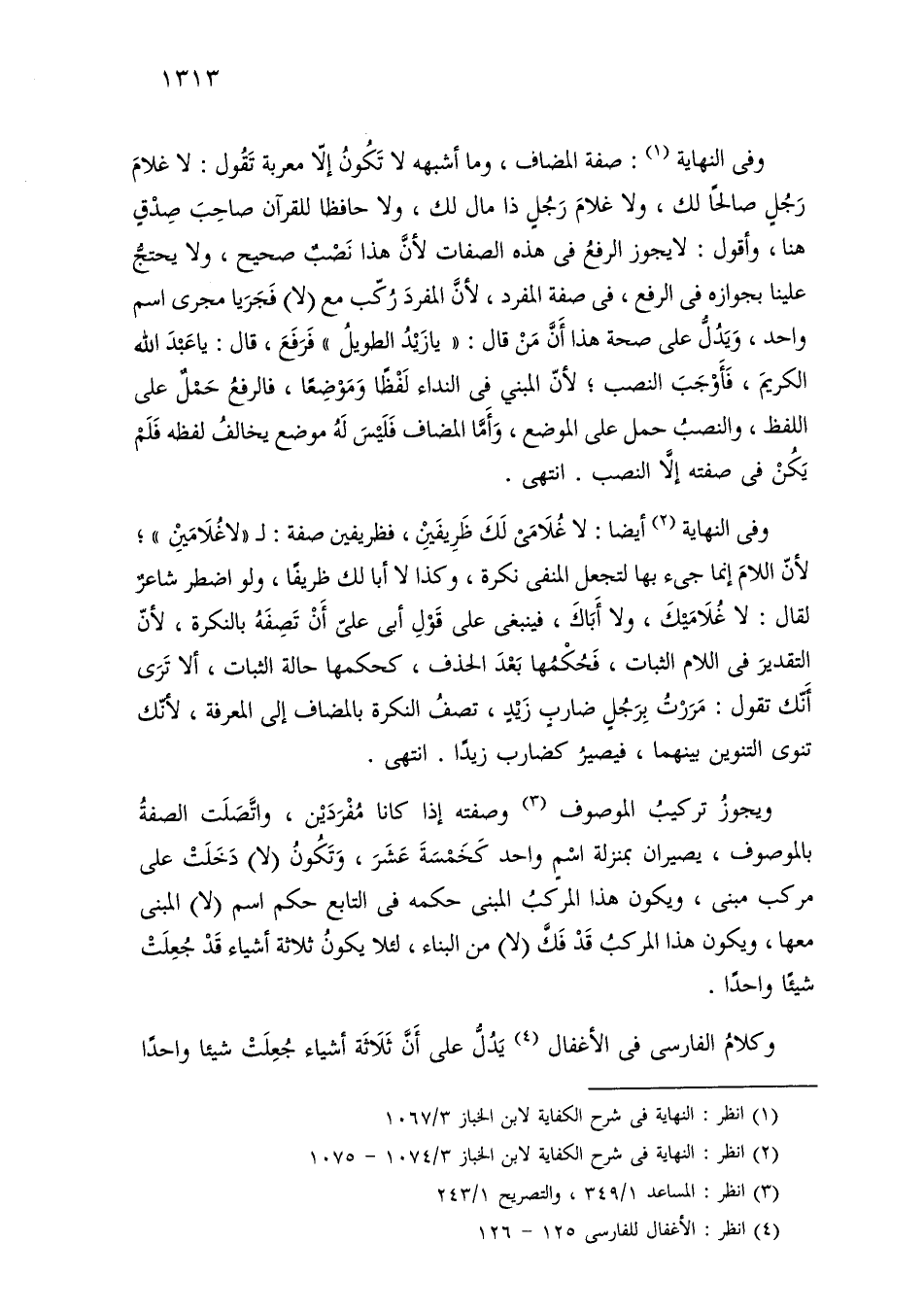 وفي النهاية: صفة المضاف، وما أشبهه لا تكون إلا معربة تقول: لا غلام رجل صالحًا لك، ولا غلام رجل ذا مالك لك، ولا حافظًا للقرآن صاحب صدق هنا، وأقول: لا يجوز الرفع في هذه الصفات لأن هذا نصب صحيح، ولا يحتج علينا بجوازه في الرفع، في صفة المفرد، لأن المفرد ركب مع (لا) فجريا مجرى اسم واحد، ويدل على صحة هذا أن من قال: «يا زيد الطويل» فرفع، قال: يا عبد الله الكريم، فأوجب النصب؛ لأن المبني في النداء لفظًا وموضعًا، فالرفع حمل على اللفظ، والنصب حمل على الموضع، وأما المضاف فليس له موضع يخالف لفظه فلم يكن في صفته إلا النصب. انتهى.