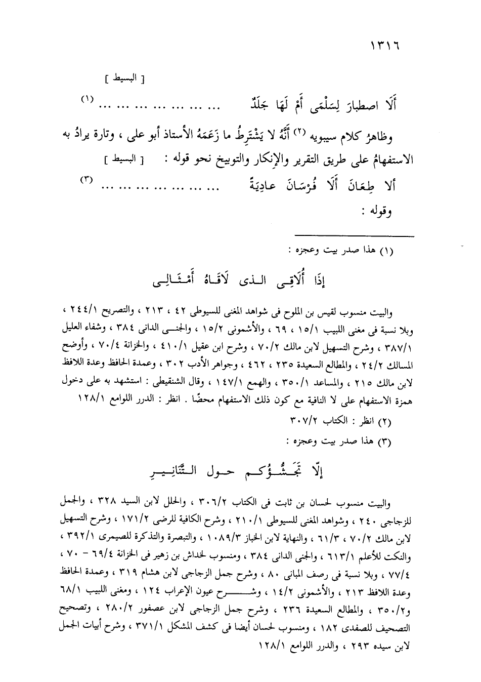 وظاهر كلام سيبويه أنه لا يشترط ما زعمه الأستاذ أبو علي، وتارة يراد به الاستفهام على طريق التقرير والإنكار والتوبيخ نحو قوله: