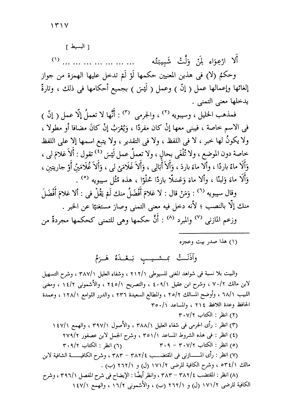فمذهب الخليل، وسيبويه، والجرمي: أنها لا تعمل إلا عمل (إن) في الاسم خاصة، فيبنى معها إن كان مفردًا، ويعرب إن كان مضافًا أو مطولاً، ولا يكون لها خبر، لا في اللفظ، ولا في التقدير، ولا يتبع اسمها إلا على اللفظ خاصة دون الموضع، ولا تلغى بحال، ولا تعمل عمل ليس تقول: ألا غلام لي، وألا ماء باردًا، وألا ماء بارد، وألا أبالي، وألا غلامي لي، وألا غلامين أو جاريتين، وألا ماء ولبنا، وألا ماء وعسلاً باردًا حلوًا، هذه مثل سيبويه.