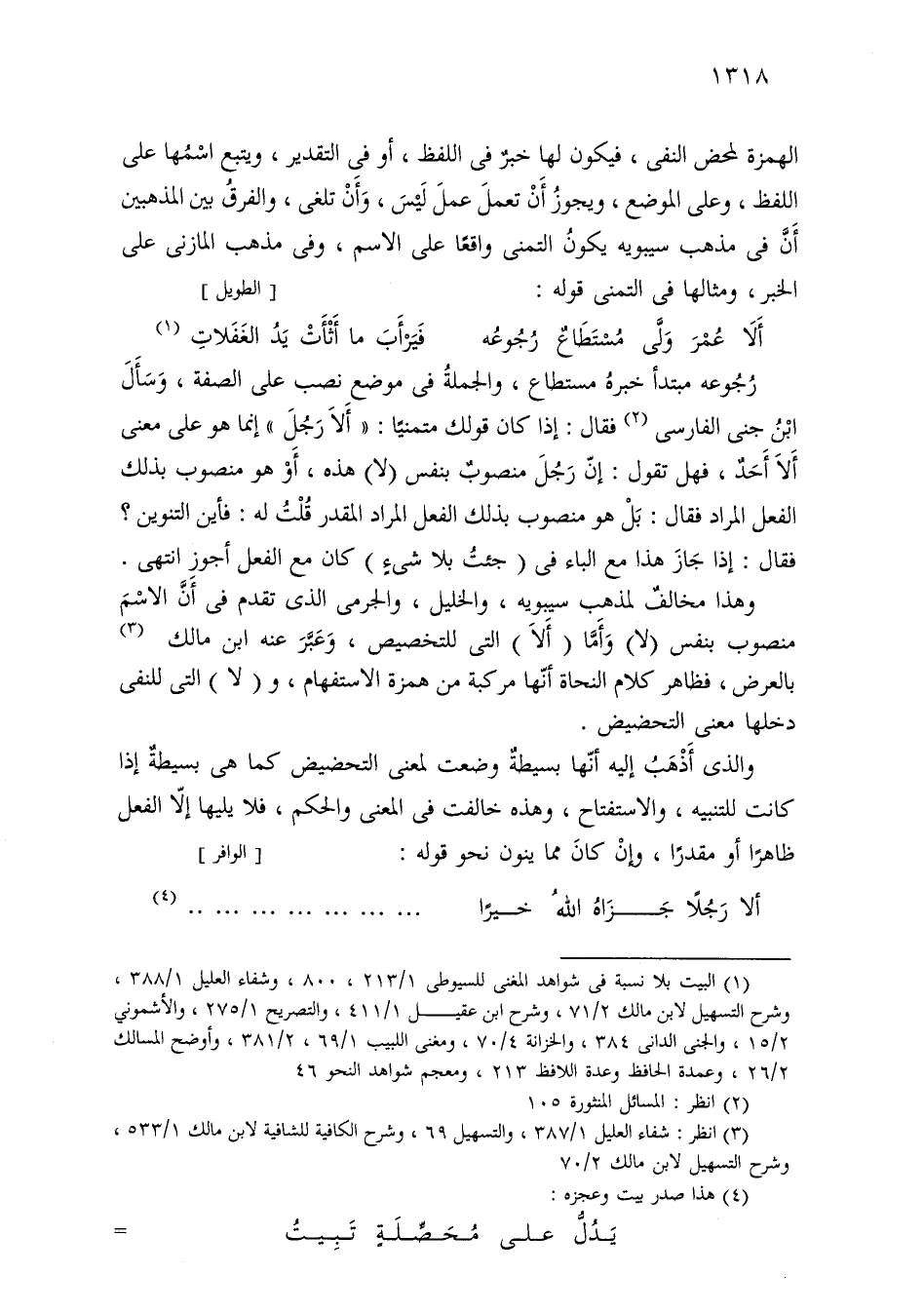 رجوعه مبتدأ خبره مستطاع، والجملة في موضع نصب على الصفة، وسأل ابن جني الفارسي فقال: إذا كان قولك متمنيًا: «ألا رجل» إنما هو على معنى ألا أحد، فهل تقول: إن رجل منصوب بنفس (لا) هذه، أو هو منصوب بذلك الفعل المراد فقال: بل هو منصوب بذلك الفعل المراد المقدر قلت له: فأين التنوين؟ فقال: إذا جاز هذا مع الباء في (جئت بلا شيء) كان مع الفعل أجوز انتهى.
