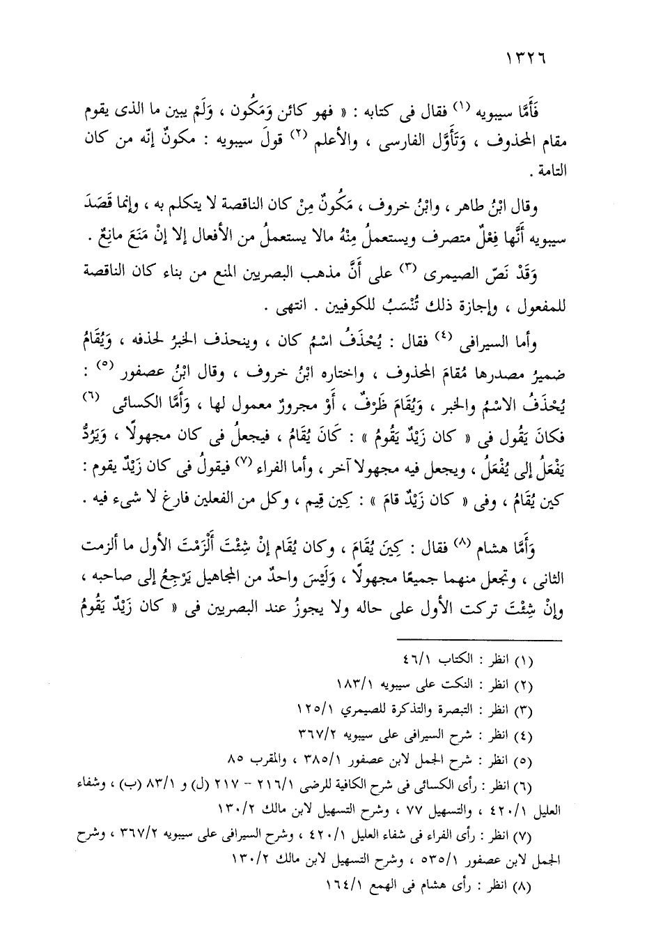 وأما السيرافي فقال: يحذف اسم كان، وينحذف الخبر لحذفه، ويقام ضمير مصدرها مقام المحذوف، واختاره ابن خروف، وقال ابن عصفور: يحذف الاسم والخبر، ويقام ظرف، أو مجرور معمول لها، وأما الكسائي فكان يقول في «كان زيد يقوم»: كان يقام، فيجعل في كان مجهولاً، ويرد يفعل إلى يفعل، ويجعل فيه مجهولاً آخر، وأما الفراء فيقول في كان زيد يقوم: كين يقام، وفي «كان زيد قام»: كين قيم، وكل من الفعلين فارغ لا شيء فيه.