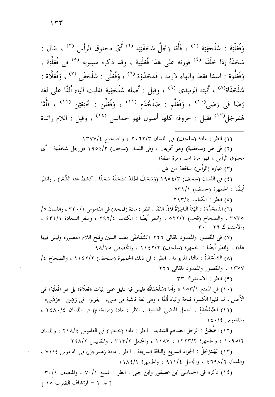 وفعلية: سلحفية، فأما رجل سحفنية أي محلوق الرأس، يقال: سحفة إذا حلقه فوزنه على هذا فعلنية، وقد ذكره سيبويه في فعلية، وفعلوة: اسمًا فقط والهاء لازمة، قمحدوة، وفعلى: سلحفى، وفعلاة: سلحفاة، أثبته الزبيدي، وقيل: أصله سلحفية فقلبت الياء ألفا على لغة رضا في رضى، وفعلم: صلخدم، وفعلن: خبعثن، فأما همرجل فقيل: حروفه كلها أصول فهو خماسي، وقيل: اللام زائدة