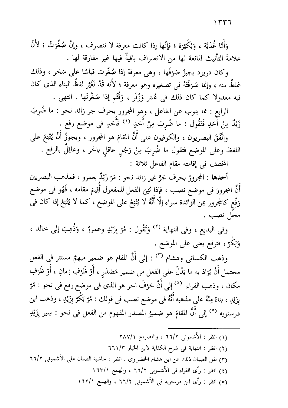 وذهب الكسائي وهشام: إلى أن المقام هو ضمير مبهم مستتر في الفعل محتمل أن يراد به ما يدل على الفعل من ضمير مصدر، أو ظرف زمان، أو ظرف مكان، وذهب الفراء إلى أن حرف الجر هو الذي في موضع رفع في نحو: مر بزيد، بناء منه على مذهبه أنه في موضع نصب في قولك: مر بكر بزيد، وذهب ابن درستويه إلى أن المقام هو ضمير المصدر المفهوم من الفعل في نحو: سير بزيد