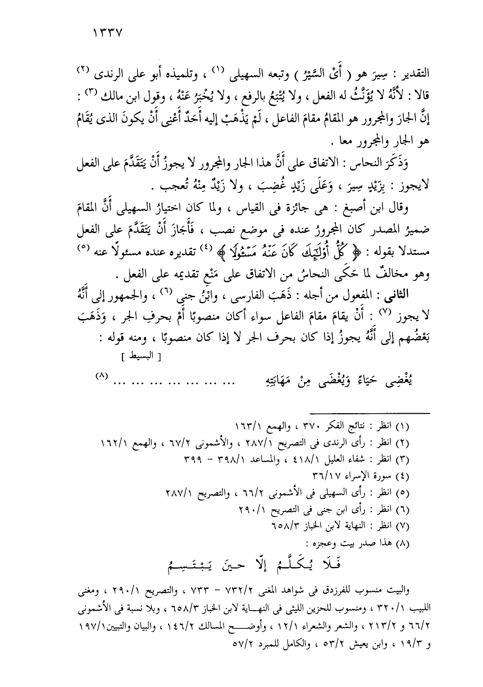 وقال ابن أصبغ: هي جائزة في القياس، ولما كان اختيار السهيلي أن المقام ضمير المصدر كان المجرور عنده في موضع نصب، فأجاز أن يتقدم على الفعل مستدلاً بقوله: «كل أولئك كان عنه مسئولا» تقديره عنده مسئولاً عنه وهو مخالف لما حكى النحاس من الاتفاق على منع تقديمه على الفعل.