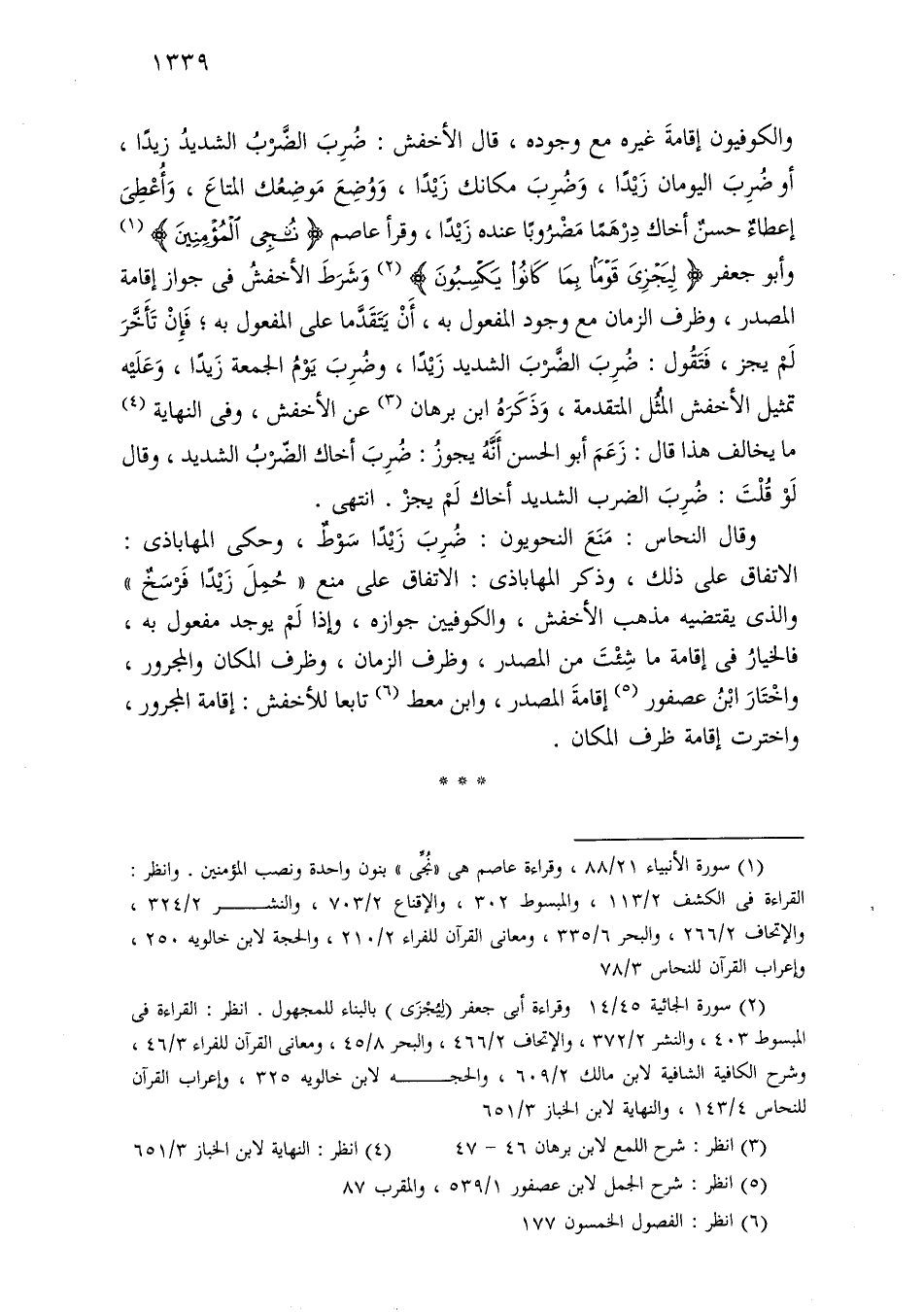 والكوفيون إقامة غيره مع وجوده، قال الأخفش: ضرب الضرب الشديد زيدًا، أو ضرب اليومان زيدًا، وضرب مكانك زيدًا، ووضع موضعك المتاع، وأعطى إعطاء حسن أخاك درهمًا مضروبًا عنده زيدًا، وقرأ عاصم «ننجي المؤمنين» وأبو جعفر «ليجزى قوما بما كانوا يكسبون» وشرط الأخفش في جواز إقامة المصدر، وظرف الزمان مع وجود المفعول به، أن يتقدما على المفعول به؛ فإن تأخر لم يجز، فتقول: ضرب الضرب الشديد زيدًا، وضرب يوم الجمعة زيدًا، وعليه تمثيل الأخفش المثل المتقدمة، وذكره ابن برهان عن الأخفش، وفي النهاية ما يخالف هذا قال: زعم أبو الحسن أنه يجوز: ضرب أخاك الضرب الشديد، وقال لو قلت: ضرب الضرب الشديد أخاك لم يجز. انتهى.