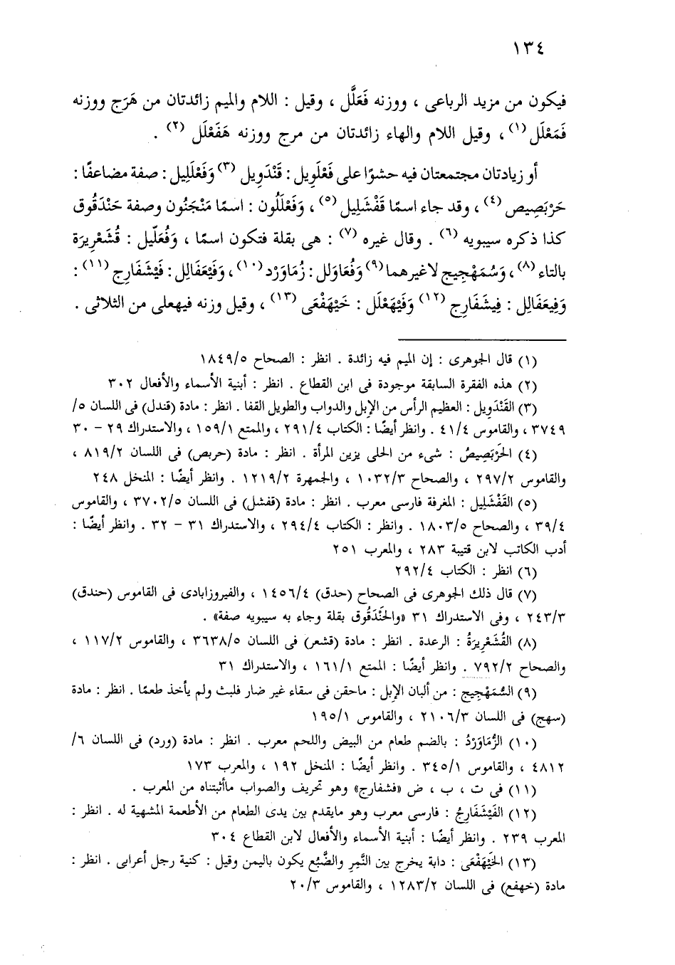 أو زيادتان مجتمعتان فيه حشوًا على فعلويل: قندويل وفعلليل: صفة مضاعفًا: حربصيص، وقد جاء اسمًأ قفشليل، وفعللون: اسمًا منجنون وصفة حندقوق كذا ذكره سيبويه. وقال غيره: هي بقلة فتكون اسمًا، وفعليل: قشعريرة بالتاء، وسمهجيج لا غيرهما وفعاولل: زماورد، وفيعفالل: فيشفارج: وفيعفالل: فيشفارج وفيهعلل: خيهفعي، وقيل وزنه فيهعلى من الثلاثي.
