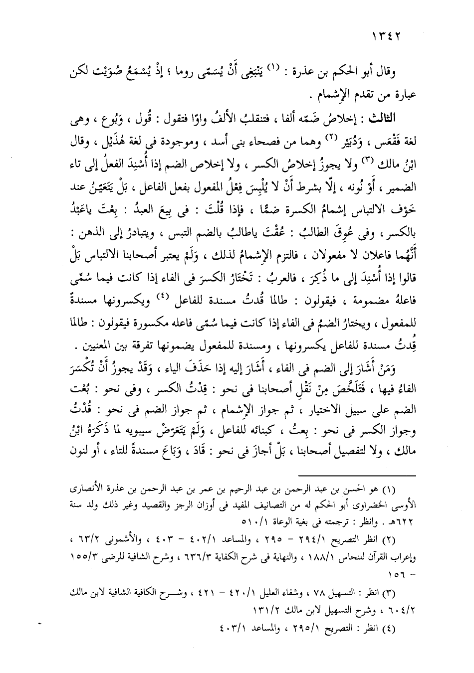 الثالث: إخلاص ضمه ألفا، فتنقلب الألف واوًا فتقول: قول، وبوع، وهي لغة فقعس، ودبير وهما من فصحاء بني أسد، وموجودة في لغة هذيل، وقال ابن مالك ولا يجوز إخلاص الكسر، ولا إخلاص الضم إذا أسند الفعل إلى تاء الضمير، أو نونه، إلا بشرط أن لا يلبس فعل المفعول بفعل الفاعل، بل يتعين عند خوف الالتباس إشمام الكسرة ضمًا، فإذا قلت: في بيع العبد: بعت يا عبد بالكسر، وفي عوق الطالب: عقت يا طالب بالضم التبس، ويتبادر إلى الذهن: أنهما فاعلان لا مفعولان، فالتزم الإشمام لذلك، ولم يعتبر أصحابنا الالتباس بل قالوا إذا أسند إلى ما ذكر، فالعرب: تختار الكسر في الفاء إذا كانت فيما سمى فاعله مضمومة، فيقولون: طالما قدت مسندة للفاعل ويكسرونها مسندة للمفعول، ويختار الضم في الفاء إذا كانت فيما سمى فاعله مكسورة فيقولون: طالما قدت مسندة للفاعل يكسرونها، ومسندة للمفعول يضمونها تفرقة بين المعنيين.