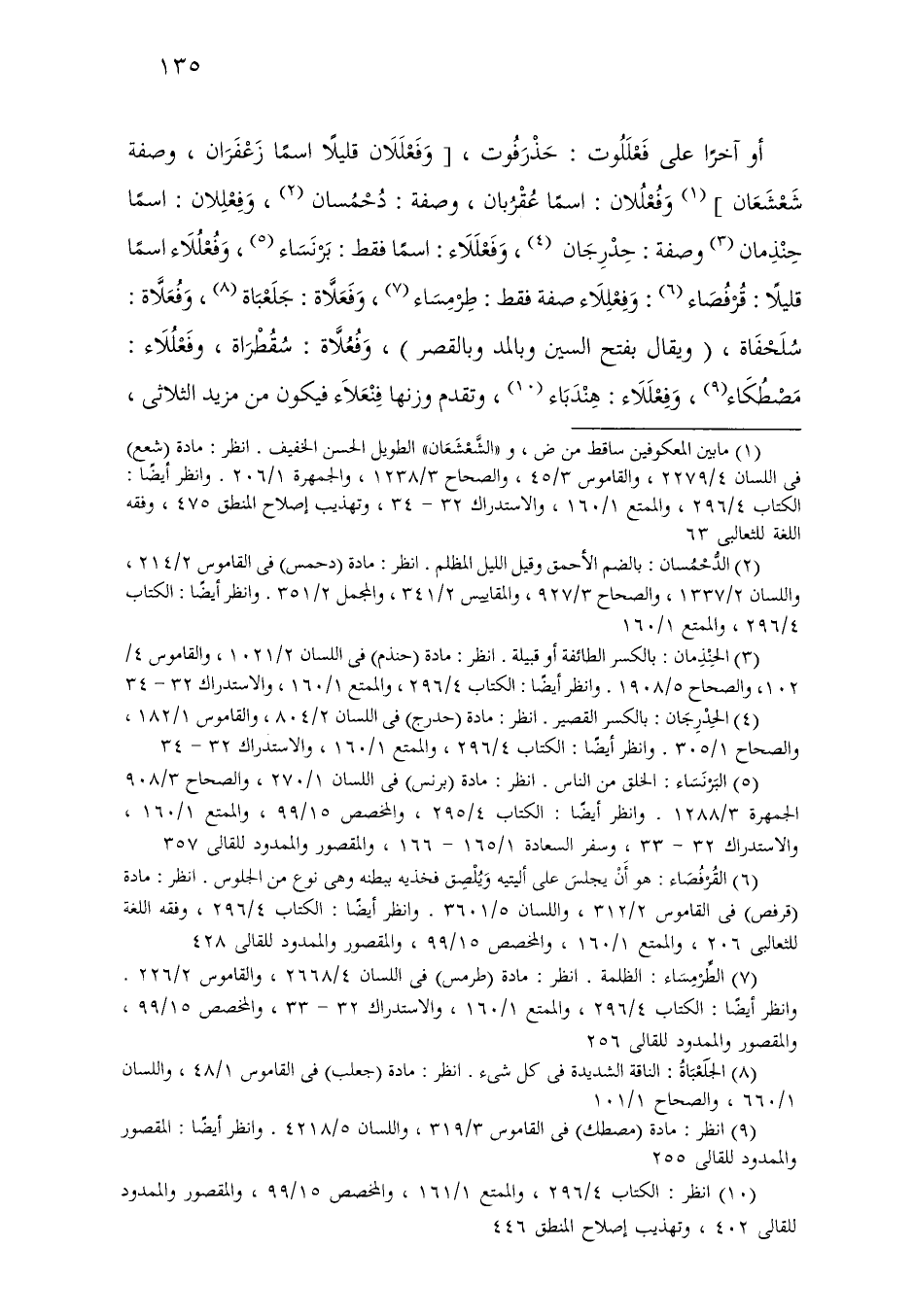 أو آخرًا على فعللوت: حذرفوت، [وفعللان قليلاً اسمًا زعفران، وصفة شعشعان] وفعللان: اسمًا عقربان، وصفة: دحمسان، وفعللان: اسمًا حنذمان وصفة: حدرجان، وفعللاء: اسمًا فقط: برنساء، وفعللاء اسمًا قليلاً: قرفصاء: وفعللاء صفة فقط: طرمساء، وفعلاة: جلعباة، وفعلاة: سلحفاة، (ويقال بفتح السين وبالمد وبالقصر)، وفعلاة: سقطراة، وفعللاء: مصطكاء، وفعللاء: هندباء، وتقدم وزنها فنعلاء فيكون من مزيد الثلاثي،
