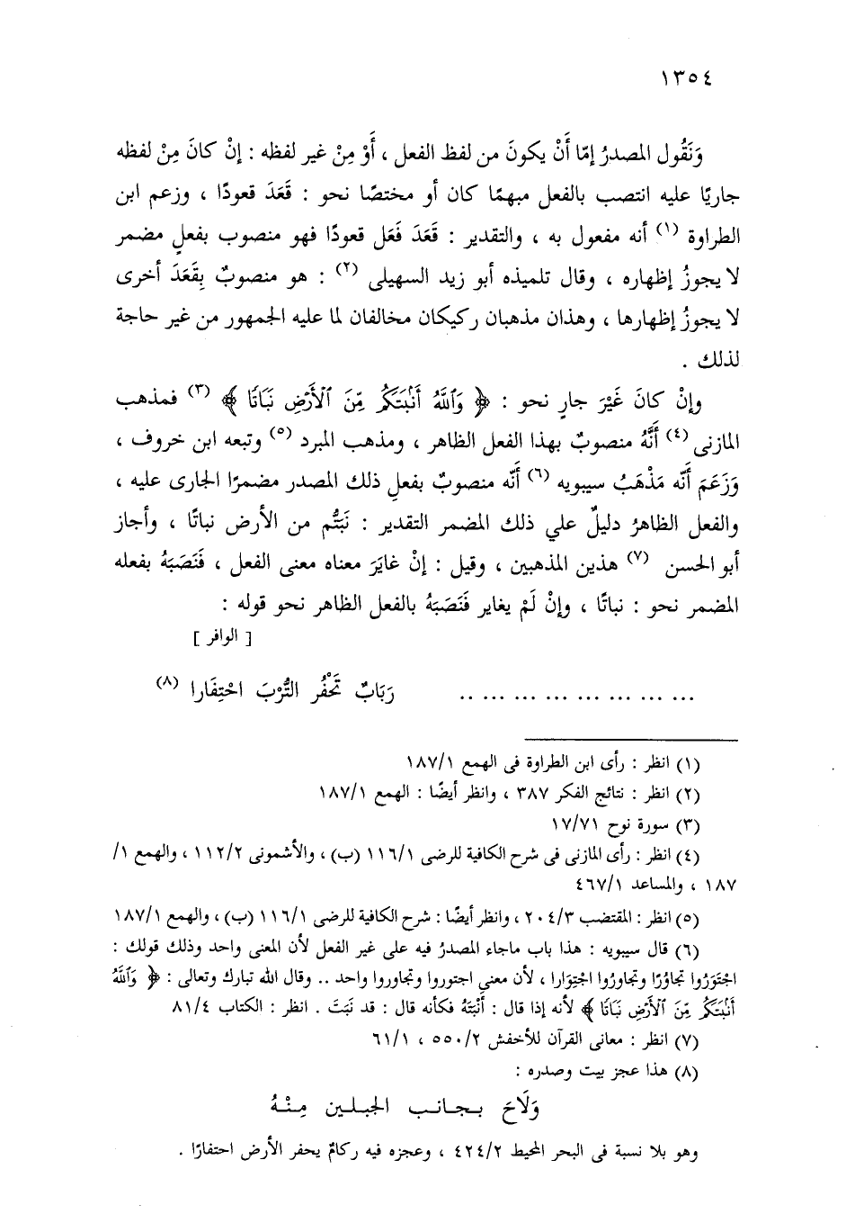 وإن كان غير جار نحو: «والله أنبئكم من الأرض نباتا» فمذهب المازني أنه منصوب بهذا الفعل الظاهر، ومذهب المبرد وتبعه ابن خروف، وزعم أنه مذهب سيبويه أنه منصوب بفعل ذلك المصدر مضمرًا الجاري عليه، والفعل الظاهر دليل على ذلك المضمر التقدير: نبتم من الأرض نباتًا، وأجاز أبو الحسن هذين المذهبين، وقيل: إن غاير معناه معنى الفعل، فنصبه بفعله المضمر نحو: نباتًا، وإن لم يغاير فنصبه بالفعل الظاهر نحو قوله: