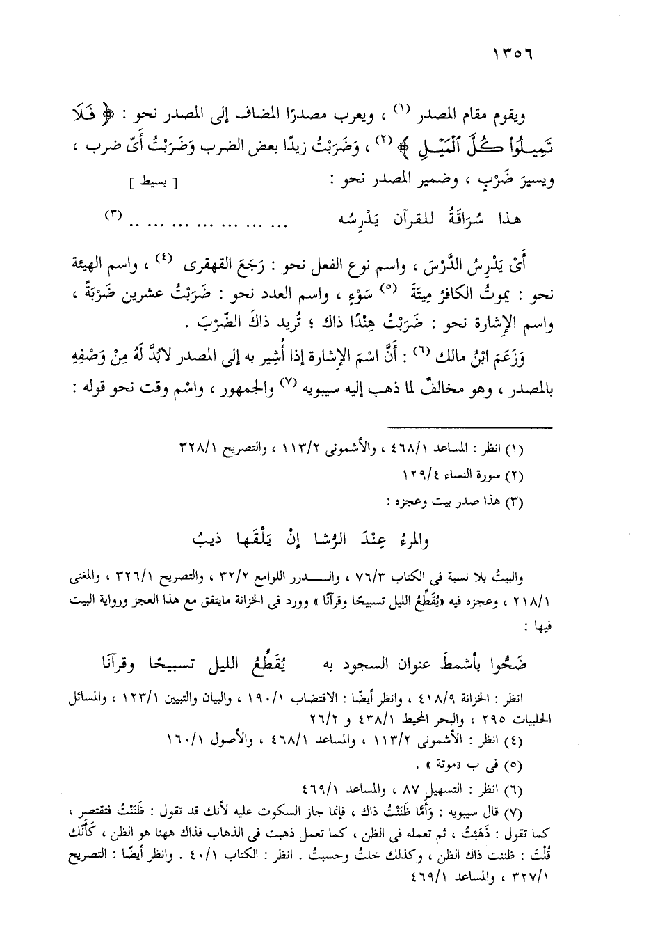 ويقوم مقام المصدر، ويعرب مصدرًا المضاف إلى المصدر نحو: «فلا تميلوا كل الميل»، وضربت زيدًا بعض الضرب وضربت أي ضرب، ويسير ضرب، وضمير المصدر نحو: