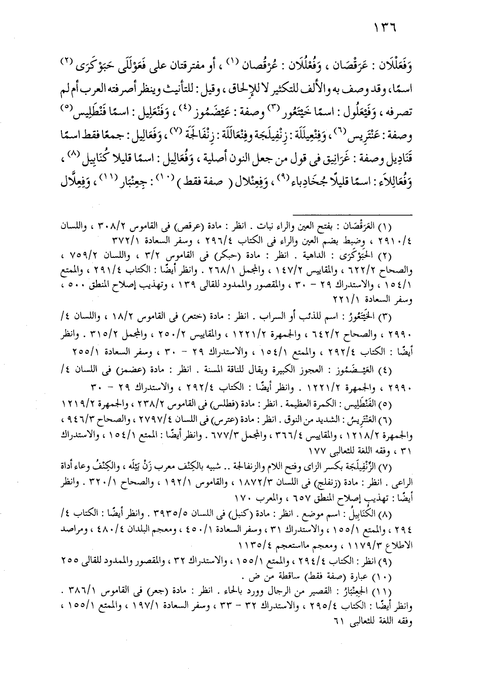 وفعللان: عرقصان، وفعللان: عرقصان، أو مفترقتان على فعوللي حبوكرى اسمًا، وقد وصف به والألف للتكثير لا للإلحاق، وقيل: للتأنيث وينظر أصرفته العرب أم لم تصرفه، وفيعلول: اسمًا خيتعور وصفة: عيضموز، وفنعليل: اسمًا فنطليس وصفة: عنتريس، وفنعيللة: زنفيلجة وفنعاللة: زنفالجة، وفعاليل: جمعًا فقط اسمًا قناديل وصفة: غرانيق في قول من جعل النون أصلية، وفعاليل: اسمًا قليلاً كنابيل، وفعاللاء: اسمًا قليلاً جخادباء، وفعنلال (صفة فقط): جعنبار، وفعلال