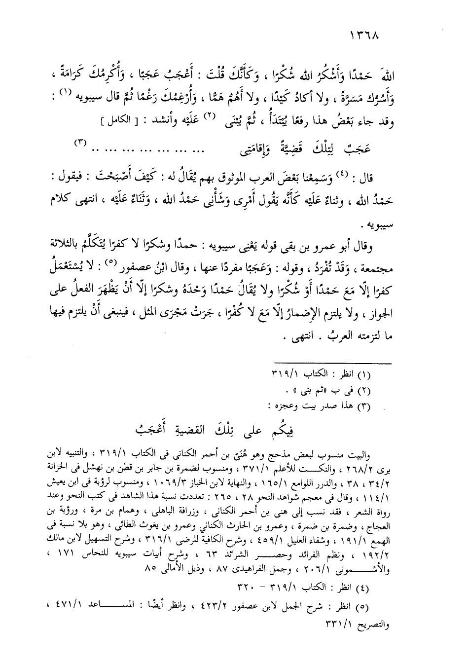 وقال أبو عمرو بن بقي قوله يعني سيبويه: حمدًا وشكرًا لا كفرًا يتكلم بالثلاثة مجتمعة، وقد تفرد، وقوله، وعجبًا مفردًا عنها، وقال ابن عصفور: لا يستعمل كفرًا إلا مع حمدًا أو شكرًا ولا يقال حمدًا وحده وشكرًا إلا أن يظهر الفعل على الجواز، ولا يلتزم الإضمار إلا مع لا كفرًا، جرت مجرى المثل، فينبغي أن يلتزم فيها ما لتزمته العرب. انتهى.