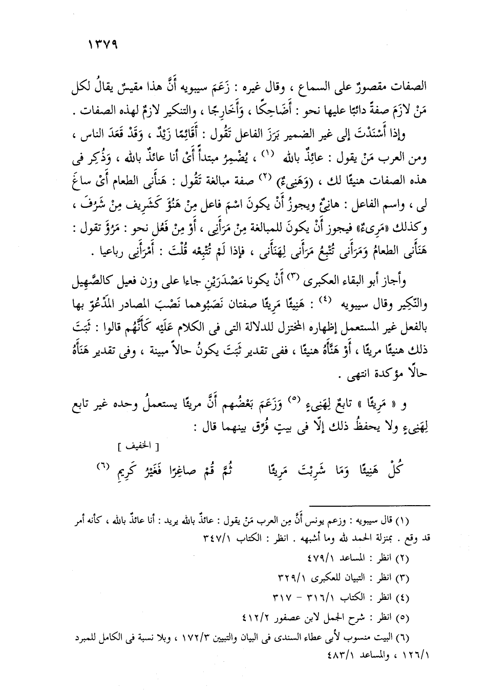وإذا أسندت إلى غير الضمير برز الفاعل تقول: أقائمًا زيد، وقد قعد الناس، ومن العرب من يقول: عائذ بالله، يضمر مبتدأ أي أنا عائذ بالله، وذكر في هذه الصفات هنيئًا لك، (وهنيء) صفة مبالغة تقول: هنأني الطعام أي ساغ لي، واسم الفاعل: هانئ ويجوز أن يكون اسم فاعل من هنؤ كشريف من شرف، وكذلك «مرئ» فيجوز أن يكون للمبالغة من مرأنى، أو من فعل نحو: مرؤ تقول: هنأني الطعام ومرأني تتبع مرأنى لهنأني، فإذا لم تتبعه قلت: أمرأني رباعيًا.