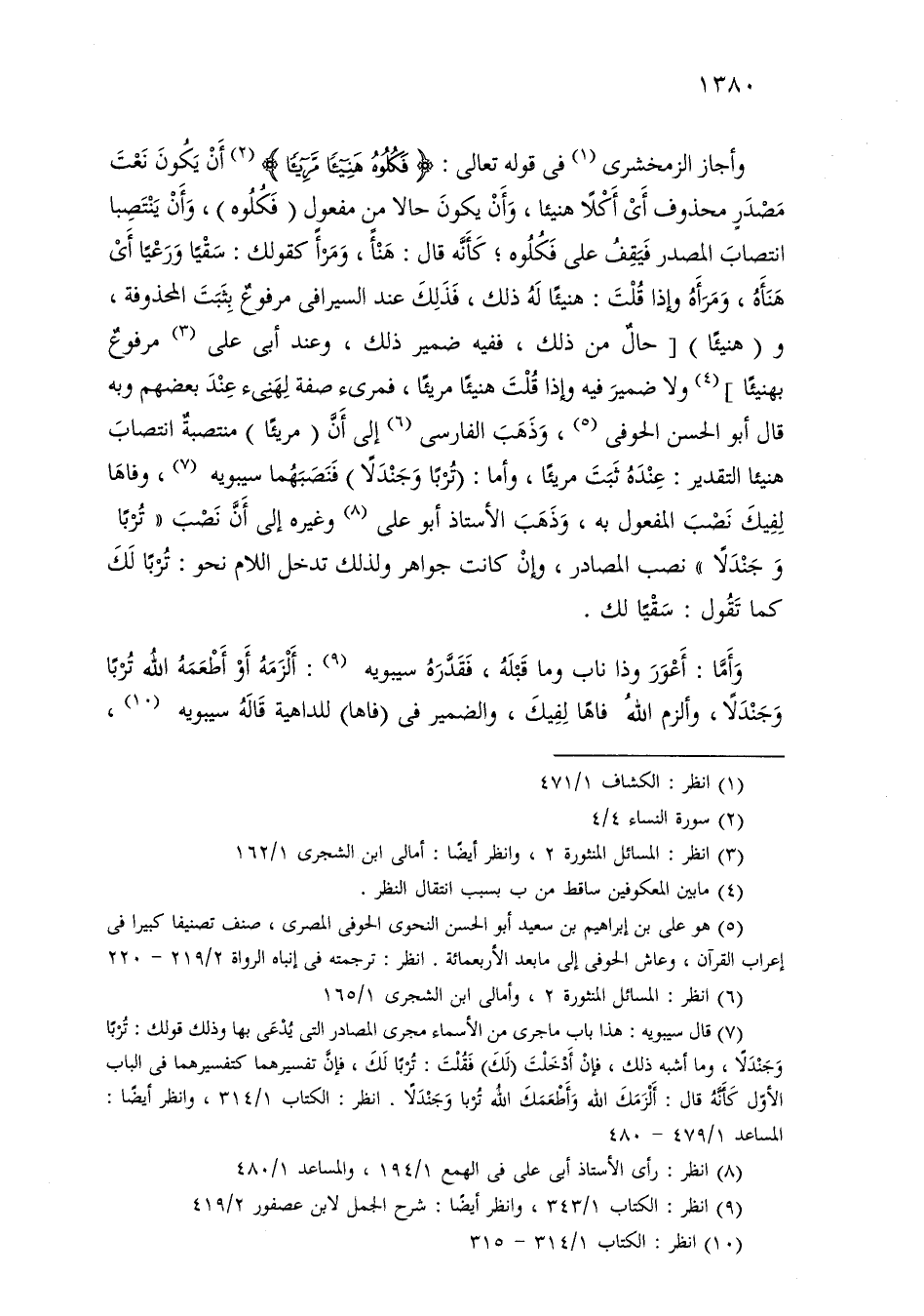 وأجاز الزمخشري في قوله تعالى: «فكلوه هنيئًا مريئًا» أن يكون نعت مصدر محذوف أي أكلاً هنيئا، وأن يكون حالاً من مفعول (فكلوه)، وأن ينتصبا انتصاب المصدر فيقف على فكلوه؛ كأنه قال: هنأ، ومرأ كقولك: سقيًا ورعيًا أي هنأه، ومرأه وإذا قلت: هنيئًا له ذلك، فذلك عند السيرافي مرفوع بثبت الحذوفة، و (هنيئًا) [حال من ذلك، ففيه ضمير ذلك، وعند أبي علي مرفوع بهنيئًا] ولا ضمير فيه وإذا قلت هنيئًا مريئًا، فمرئ صفة لهنئ عند بعضهم وبه قال أبو الحسن الحوفي، وذهب الفارسي إلى أن (مريئًا) منتصبة انتصاب هنيئًا التقدير: عنده ثبت مريئًا، وأما: (تربًا وجندلاً) فنصبهما سيبويه، وفاها لفيك نصب المفعول به، وذهب الأستاذ أبو علي وغيره إلى أن نصب «تربا وجندلا» نصب المصادر، وإن كانت جواهر ولذلك تدخل اللام نحو: تربًا لك كما تقول: سقيًا لك.