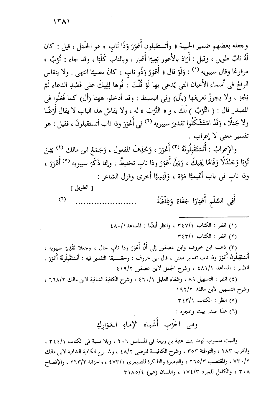 وجعله بعضهم ضمير الحبيبة «وأتستقبلون أعور وذا ناب» هو الحمل، قيل: كان له ناب طويل، وقيل: أراد بالأعور بعيرًا أعور، وبالناب كلبًا، وقد جاء «ترب» مرفوعًا وقال سيبويه: ولو قال «أعور وذو ناب» كان مصيبًا انتهى. ولا ينقاس الرفع في أسماء الأعيان التي يدعى بها لو قلت: فوها لفيك على قصد الدعاء لم يجز، ولا يجوز تعريفها (بأل) وفي البسيط: وقد أدخلوا ههنا (أل) كما فعلوا في المصدر قال: (الترب) لك، و «الترب» له، ولا يقاس هذا الباب لا يقال أرضًا ولا جبلاً، وقد استشكلوا تقدير سيبويه في أعور وذا ناب أتستقبلون، فقيل: هو تفسير معنى لا إعراب.