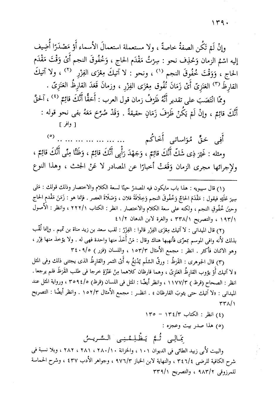وإن لم تكن الصفة خاصة، ولا مستعملة استعمال الأسماء أو مصدرًا أضيف إليه اسم الزمان وحذف نحو: سرت مقدم الحاج، وخفوق النجم أي وقت مقدم الحاج، ووقت خفوق النجم، ونحو: لا آتيك معزى الفزر، ولا آتيك القارظ العنزي أي زمان نفوق معزى الفزر، وزمان قعد القارظ العنزي.