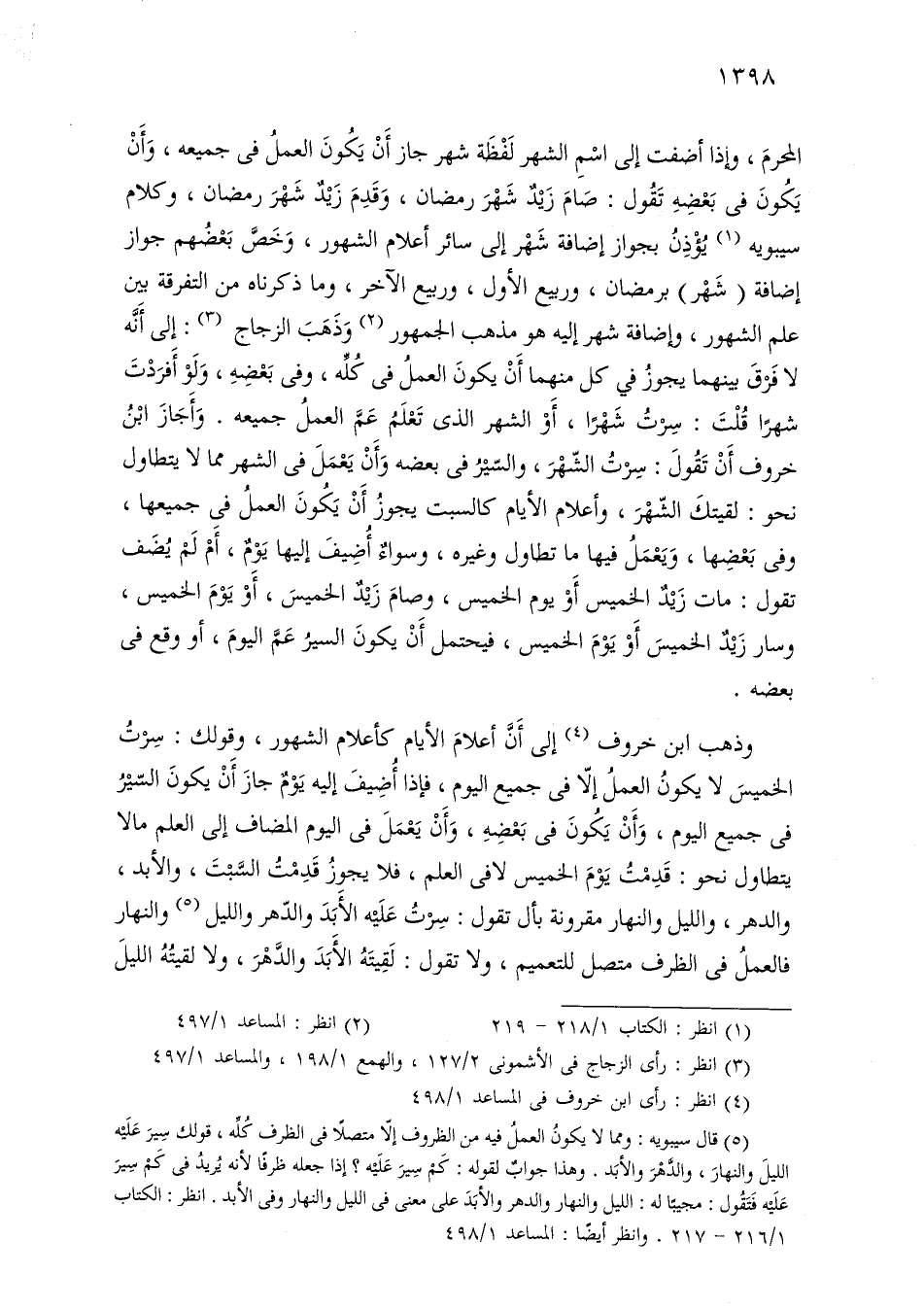 المحرم، وإذا أضفت إلى اسم الشهر لفظة شهر جاز أن يكون العمل في جميعه، وأن يكون في بعضه تقول: صام زيد شهر رمضان، وقدم زيد شهر رمضان، وكلام سيبويه يؤذن بجواز إضافة شهر إلى سائر أعلام الشهور، وخص بعضهم جواز إضافة (شهر) برمضان، وربيع الأول، وربيع الآخر، وما ذكرناه من التفرقة بين علم الشهور، وإضافة شهر إليه هو مذهب الجمهور وذهب الزجاج: إلى أنه لا فرق بينهما يجوز في كل منهما أن يكون العمل في كله، وفي بعضه، ولو أفردت شهرًا قلت: سرت شهرًا، أو الشهر الذي تعلم عم العمل جميعه. وأجاز ابن خروف أن تقول: سرت الشهر، والسير في بعضه وأن يعمل في الشهر مما لا يتطاول نحو: لقيتك الشهر، وأعلام الأيام كالسبت يجوز أن يكون العمل في جميعها، وفي بعضها، ويعمل فيها ما تطاول وغيره، وسواء أضيف إليها يوم، أم لم يضف تقول: مات زيد الخميس أو يوم الخميس، وصام زيد الخميس، أو يوم الخميس، وسار زيد الخميس أو يوم الخميس، فيحتمل أن يكون السير عم اليوم، أو وقع في بعضه.