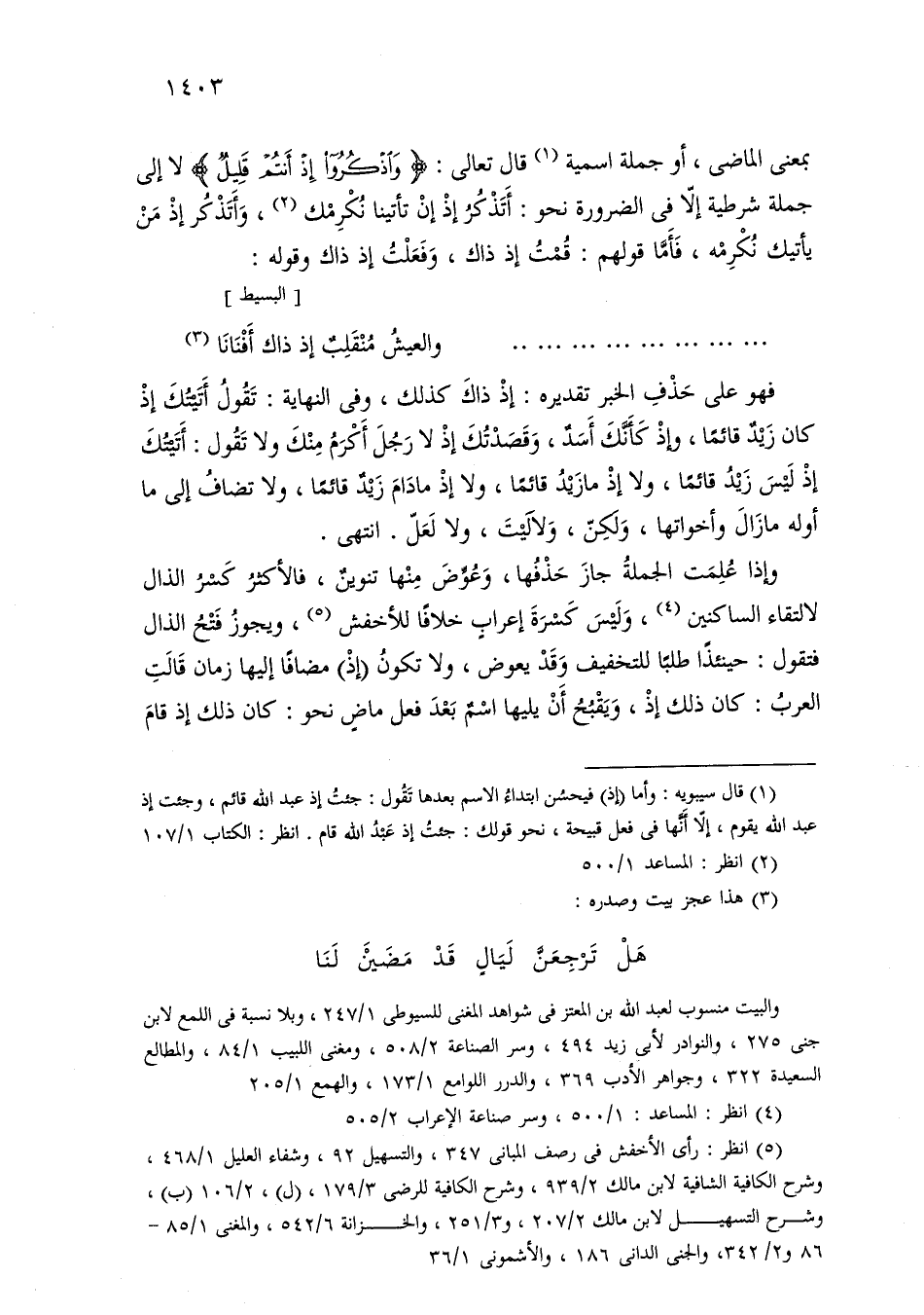 بمعنى الماضي، أو جملة اسمية قال تعالى: «واذكروا إذ أنتم قليل» لا إلى جملة شرطية إلا في الضرورة نحو: أتذكر إذ تأتينا نكرمك، وأتذكر إذ من يأتيك نكرمه، فأما قولهم: قمت إذ ذاك، وفعلت إذ ذاك وقوله: