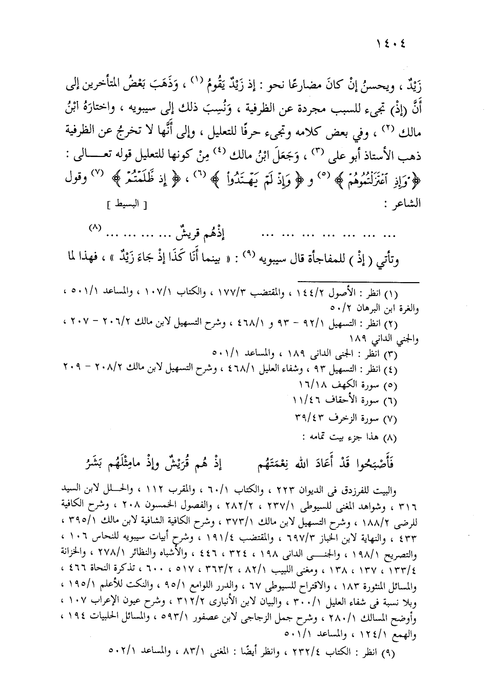 زيد، ويحسن إن كان مضارعًا نحو: إذ زيد يقوم، وذهب بعض المتأخرين إلى أن (إذ) تجيء للسبب مجردة عن الظرفية، ونسب ذلك إلى سيبويه، واختاره ابن مالك، وفي بعض كلامه وتجيء حرفًا للتعليل، وإلى أنها لا تخرج عن الظرفية ذهب الأستاذ أبو علي، وجعل ابن مالك من كونها للتعليل قوله تعالى: «وإذ اعتزلتموهم» و «وإذ لم يهتدوا»، «إذ ظلمتم» وقول الشاعر: