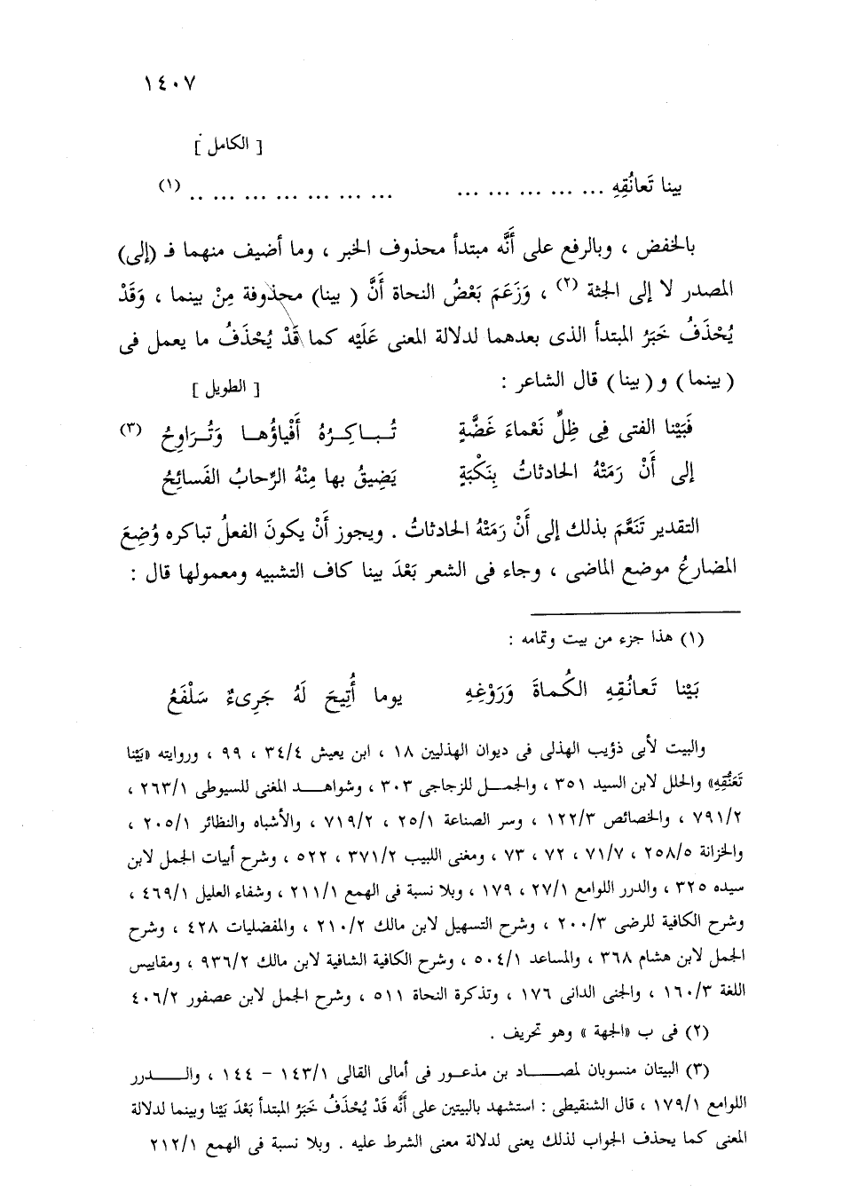 التقدير تنعم بذلك إلى أن رمته الحادثات. ويجوز أن يكون الفعل تباكره وضع المضارع موضع الماضي، وجاء في الشعر بعد بينا كاف التشبيه ومعمولها قال: