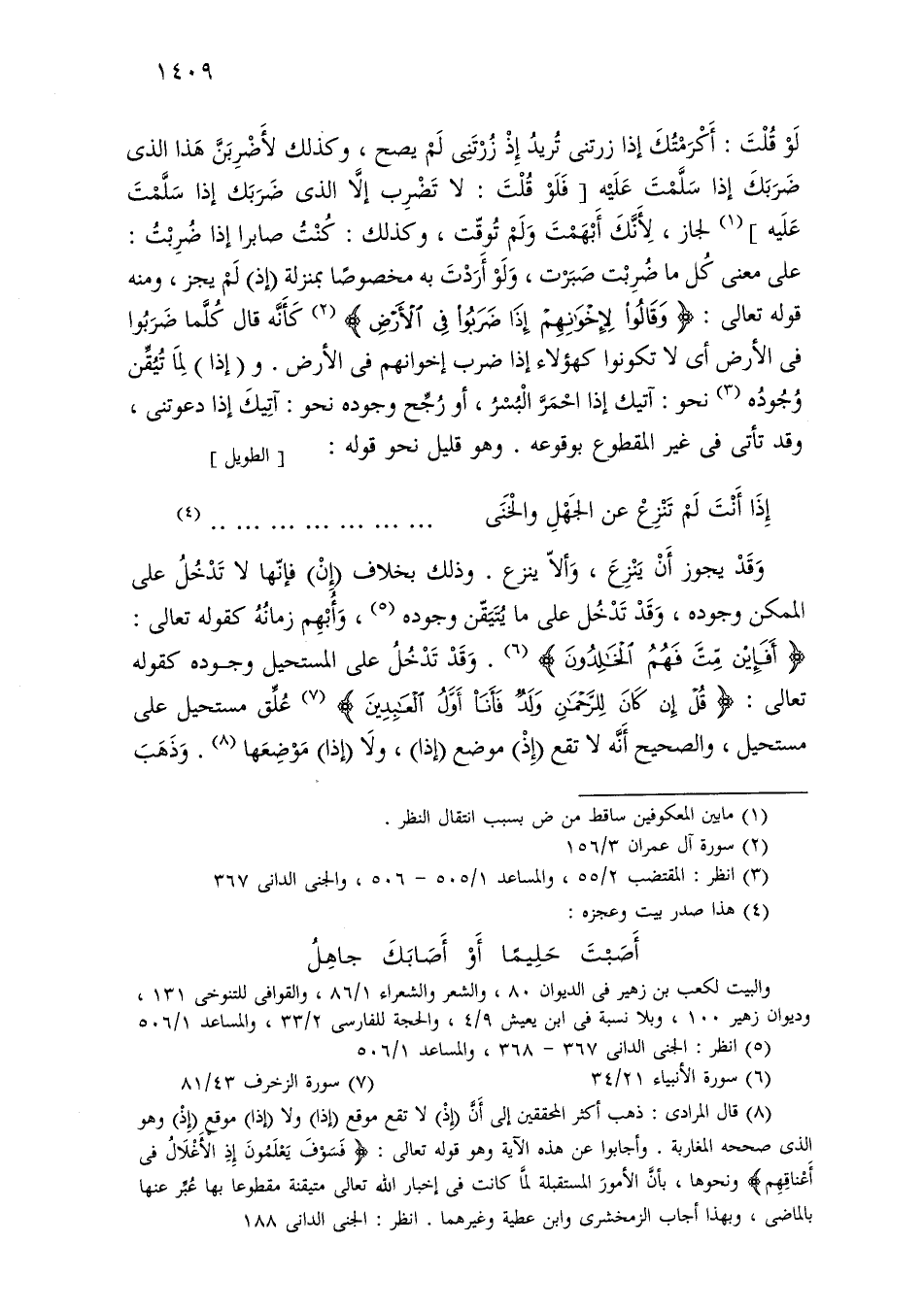 لو قلت: أكرمتك إذا زرتني تريد إذ زرتني لم يصح، وكذلك لأضربن هذا الذي ضربك إذا سلمت عليه [فلو قلت: لا تضرب غلا الذي ضربك إذا سلمت عليه] لجاز، لأنك أبهمت ولم توقت، وكذلك: كنت صابرًا إذا ضربت: على معنى كل ما ضربت صبرت، ولو أردت به مخصوصًا بمنزلة (إذ) لم يجز، ومنه قوله تعالى: «وقالوا لإخوانهم إذا ضربوا في الأرض» كأنه قال كلما ضربوا في الأرض أي لا تكونوا كهؤلاء إذا ضرب إخوانهم في الأرض. و (إذا) لما تيقن وجوده نحو: آتيك إذا احمر البسر، أو رجح وجوده نحو: آتيك إذا دعوتني، وقد تأتي في غير المقطوع بوقوعه. وهو قليل نحو قوله: