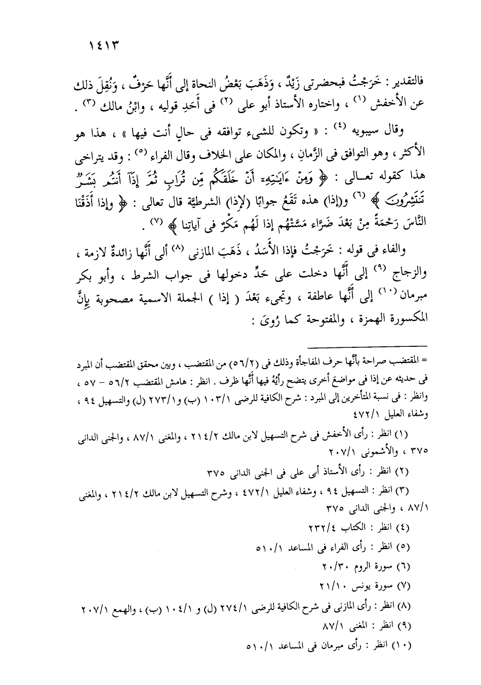 والفاء في قوله: خرجت فإذا الأسد، ذهب المازني ألى أنها زائدة لازمة، والزجاج إلى أنها دخلت على حد دخولها في جواب الشرط، وأبو بكر مبرمان إلى أنها عاطفة، وتجيء بعد (إذا) الجملة الاسمية مصحوبة بإن المكسورة الهمزة، والمفتوحة كما روى: