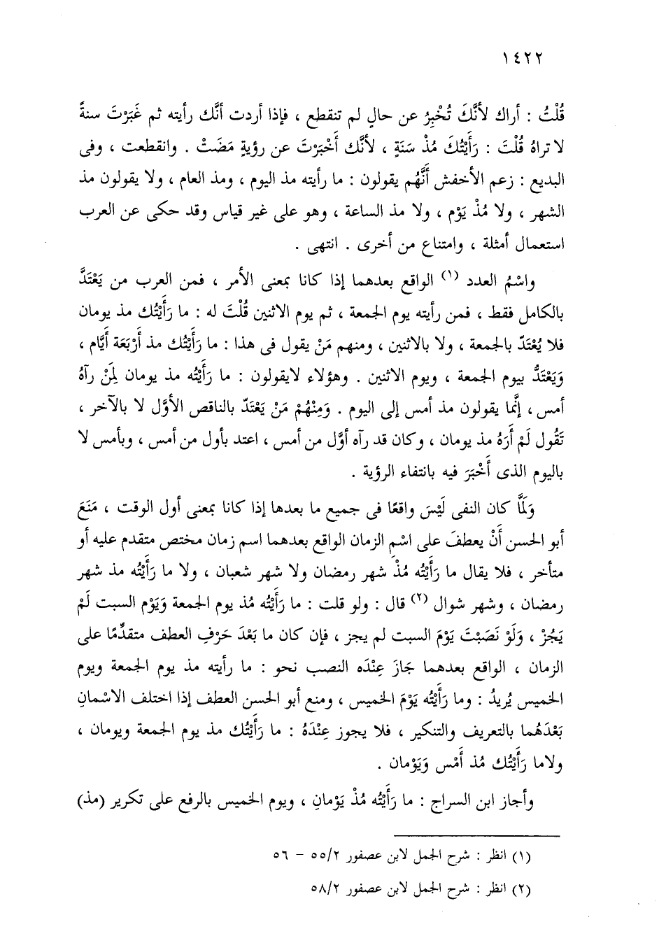 واسم العدد الواقع بعدهما إذا كانا بمعنى الأمر، فمن العرب من يعتد بالكامل فقط، فمن رأيته يوم الجمعة، ثم يوم الاثنين قلت له: ما رأيتك مذ يومان فلا يعتد بالجمعة، ويوم الاثنين. وهؤلاء لا يقولون: ما رأيته مذ يومان لمن رآه أمس، إنما يقولون مذ أمس إلى اليوم. ومنهم من يعتد بالناقص الأول لا بالآخر، تقول لم أره مذ يومان، وكان قد رآه أول من أمس، اعتد بأول من أمس، وبأمس لا باليوم الذي أخبر فيه بانتفاء الرؤية.
