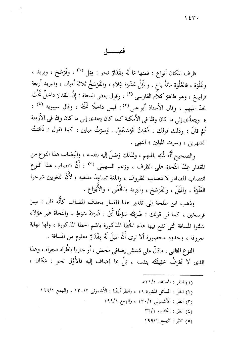 والصحيح أنه شبه بالمبهم، ولذلك وصل إليه بنفسه، وانتصاب هذا النوع من المقدار عند النحاة على الظرف، وزعم السهيلي: أن انتصاب هذا النوع انتصاب المصادر لا انتصاب الظروف، واللغة تساعد مذهبه، لأن اللغويين شرحوا الغلوة، والميل، والفرسخ، والبريد بالخطى، والأبواع.