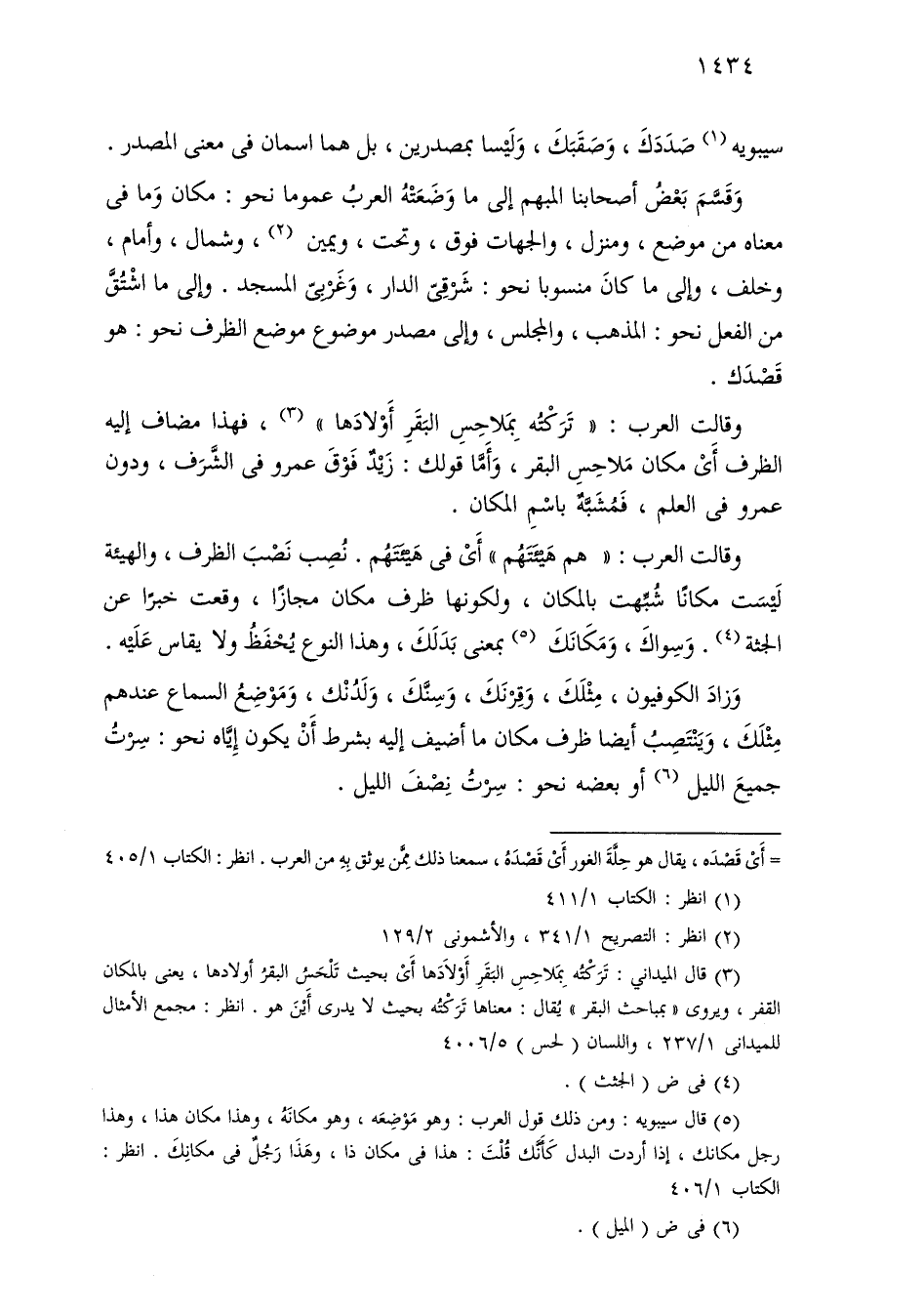 وقالت العرب: «تركته بملاحس البقر أولادها»، فهذا مضاف إليه الظرف أي مكان ملاحس البقر، وأما قولك: زيد فوق عمرو في الشرف، ودون عمرو في العلم، فمشبه باسم المكان.