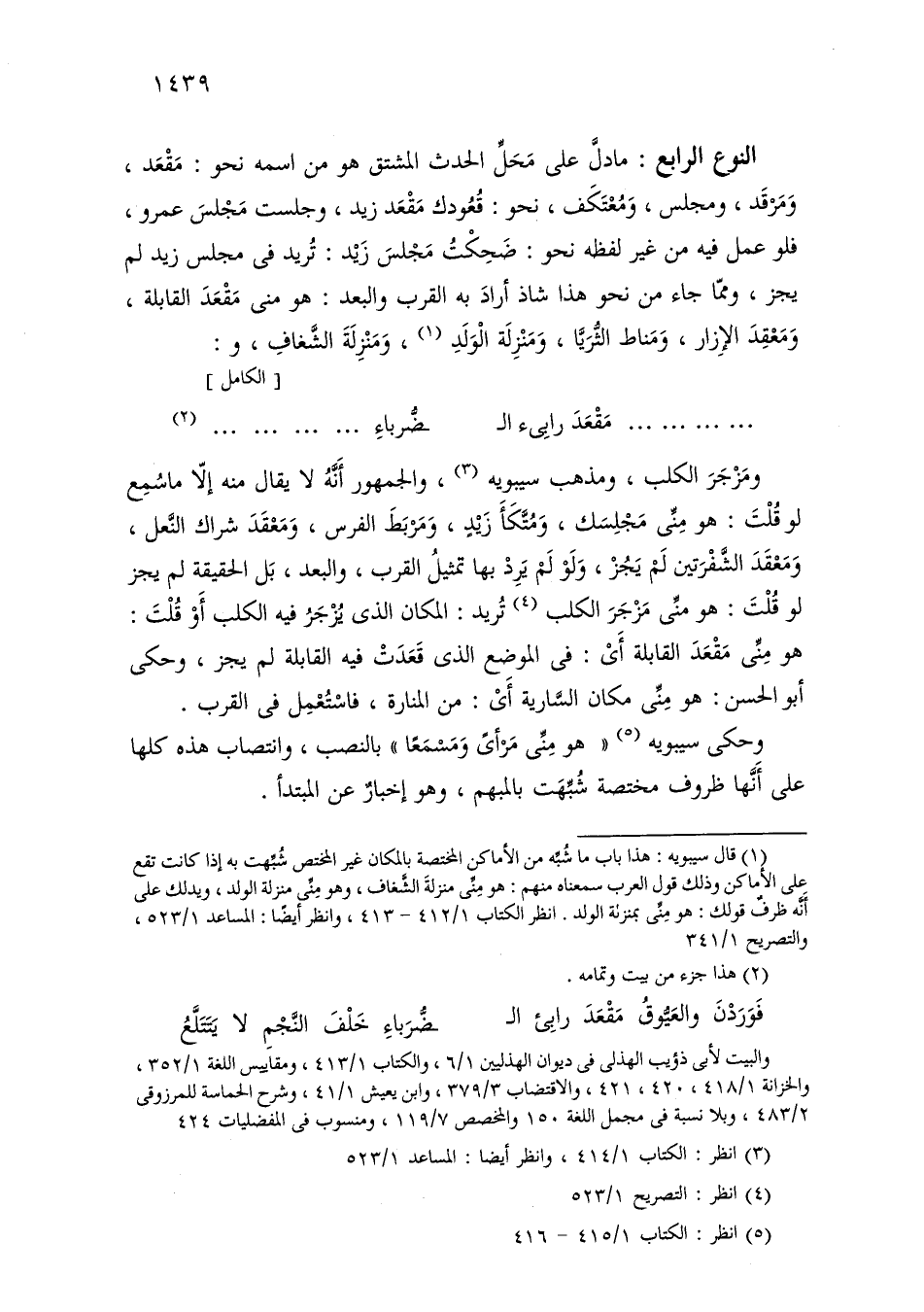 النوع الرابع: ما دل على محل الحدث المشتق هو من اسمه نحو: مقعد، ومرقد، ومجلس، ومعتكف، نحو: قعودك مقعد زيد، وجلست مجلس عمرو، فلو عمل فيه من غير لفظه نحو: ضحكت مجلس زيد: تريد في مجلس زيد لم يجز، ومما جاء من نحو هذا شاذ أراد به القرب والبعد: هو مني مقعد القابلة، ومعقد الإزار، ومناط الثريا، ومنزلة الولد، ومنزلة الشغاف، و:
