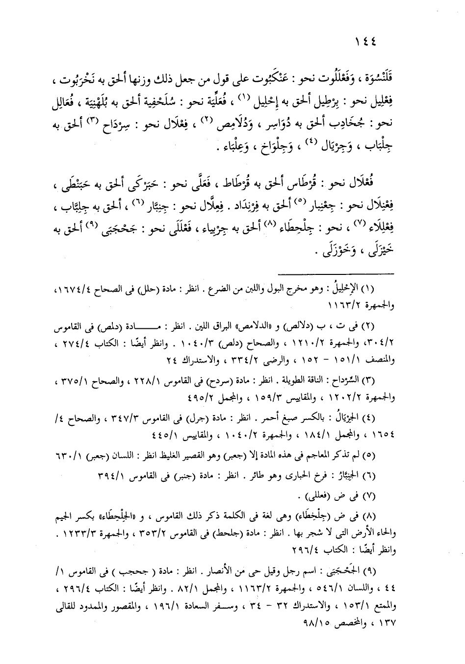 فعلال نحو: قرطاس ألحق به قرطاط، فعلى نحو: حبركى ألحق به حبنطى، فعنلال نحو: جعنبار ألحق به فرنداد. فعلال نحو: جنبار، ألحق به جلباب، فعللاء، نحو: جلحطاء ألحق به جربياء، فعللى نحو: جحجبى ألحق به خيزلي، وخوزلي.