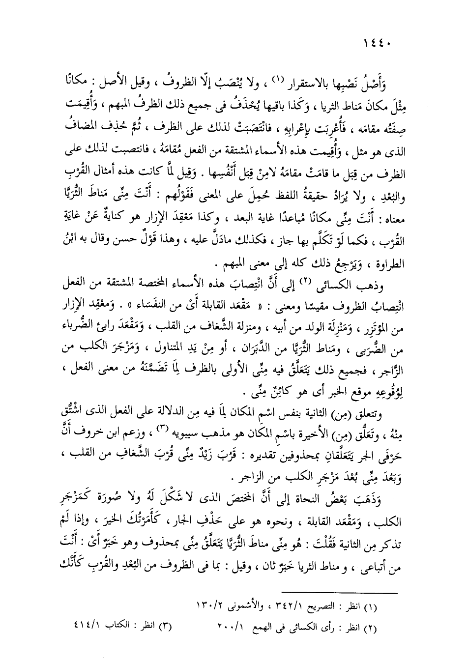 وذهب الكسائي إلى أن انتصاب هذه الأسماء المختصة المشتقة من الفعل انتصاب الظروف مقيسًا ومعنى: «مقعد القابلة أي من النفساء». ومعقد الإزار من المؤتزر، ومنزلة الولد من أبيه، ومنزلة الشغاف من القلب، ومقعد رابئ الضرباء من الضربى، ومناط الثريا من الدبران، أو من يد المتناول، ومزجر الكلب من الزاجر، فجميع ذلك يتعلق فيه منى الأولى بالظرف لما تضمنه من معنى الفعل، لوقوعه موقع الخبر أي هو كائن مني.