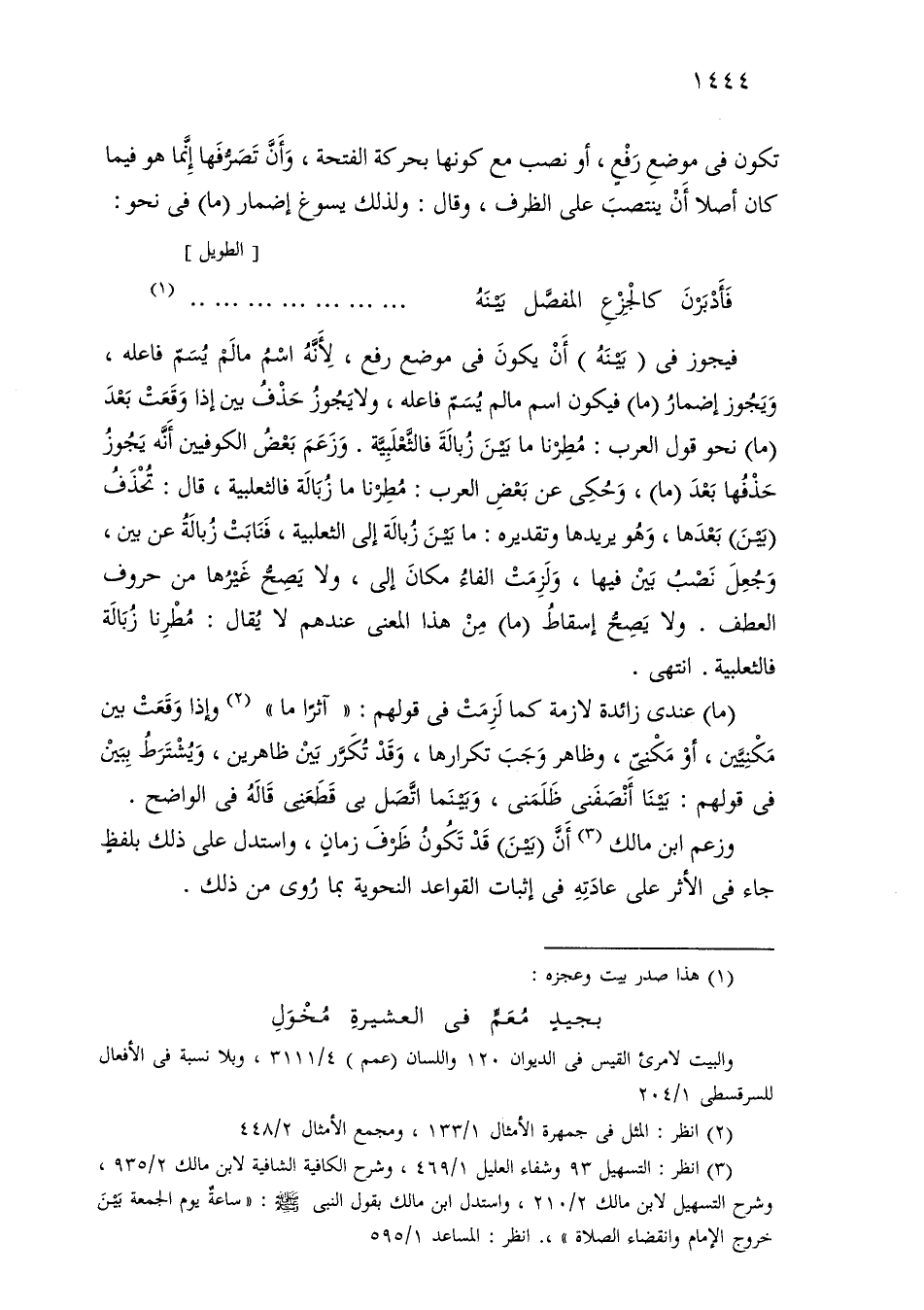 (ما) عندي زائدة لازمة كما لزمت في قولهم: «آثرا ما» وإذا وقعت بين مكنيين، أو مكنى، وظاهر وجب تكرارها، وقد تكرر بين ظاهرين، ويشترط يبين في قولهم: بينا أنصفني ظلمني، وبينما اتصل بي قطعني قاله في الواضح.