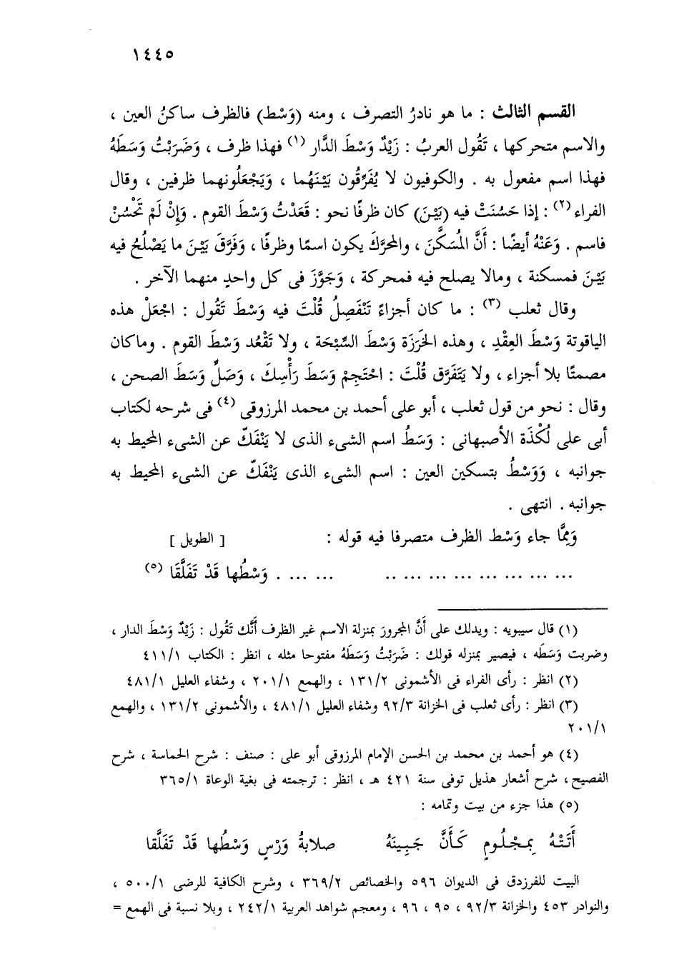 وقال ثعلب: ما كان أجزاء تنفصل قلت فيه وسط تقول: اجعل هذه الياقوت وسط العقد، وهذه الخرزة وسط السبحة، ولا تقعد وسط القوم. وما كان مصمتًا بلا أجزاء، ولا يتفرق قلت: احتجم وسط رأسك، وصل وسط الصحن، وقال: نحو من قول ثعلب، أبو علي أحمد بن محمد المرزوقي في شرحه لكتاب أبي علي لكذة الأصبهاني: وسط اسم الشيء الذي لا ينفك عن الشيء المحيط به جوانبه، ووسط بتسكين العين: اسم الشيء الذي ينفك عن الشيء المحيط به جوانبه. انتهى.