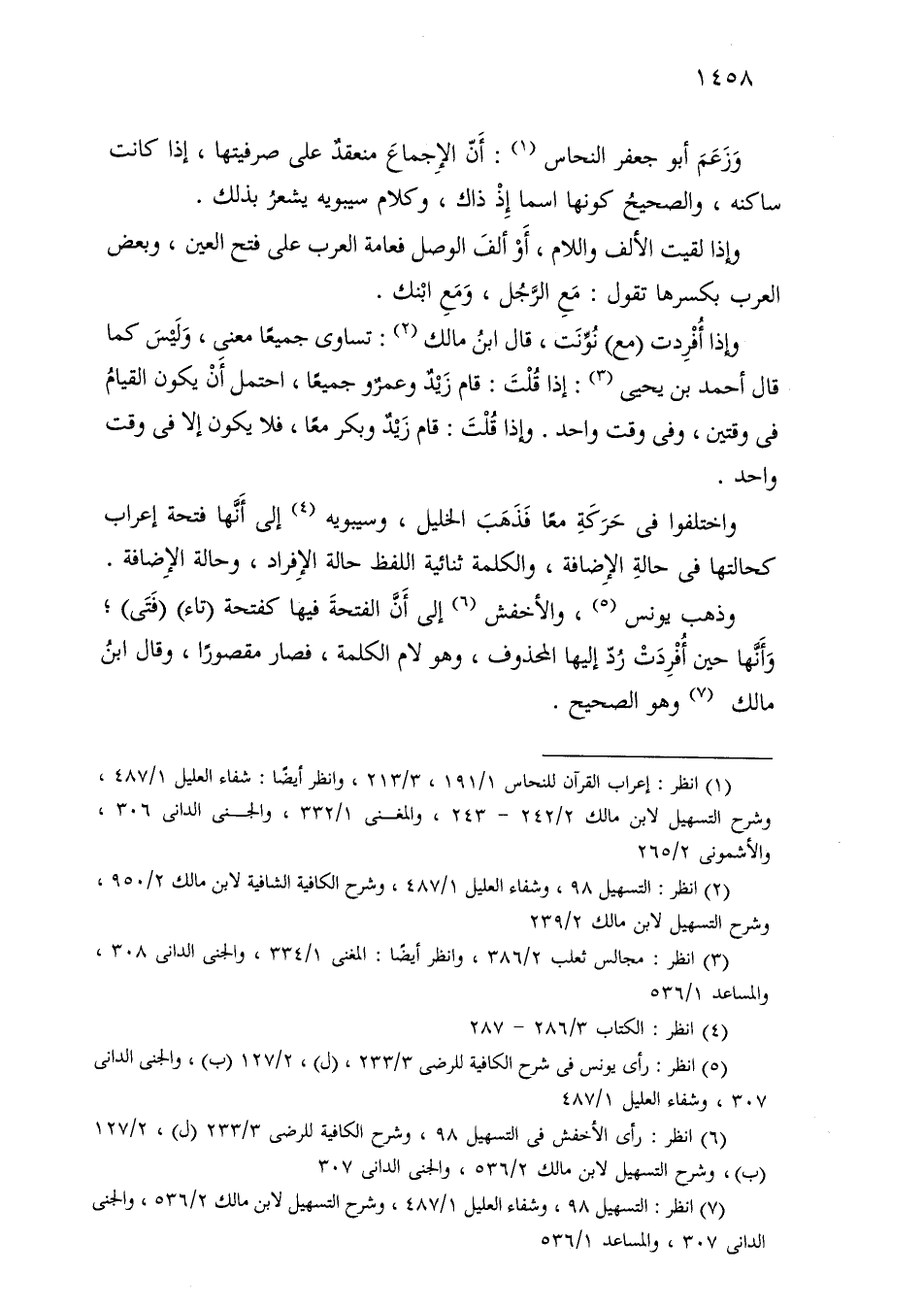وزعم أبو جعفر النحاس: أن الإجماع منعقد على صرفيتها، إذا كانت ساكنه، والصحيح كونها اسمًا إذ ذاك، وكلام سيبويه يشعر بذلك.