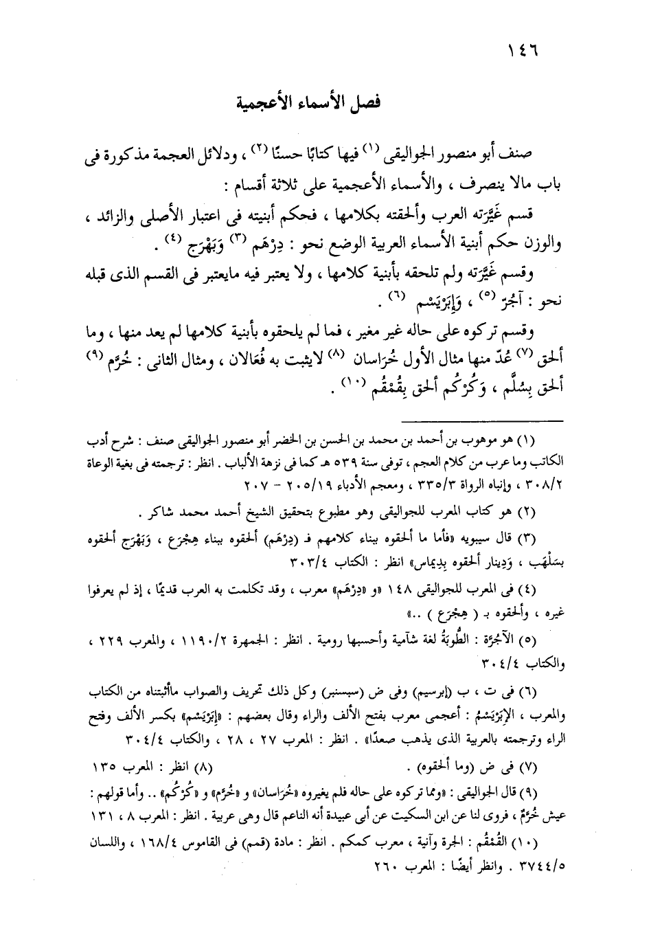 صنف أبو منصور الجواليقي فيها كتابًا حسنًا، ودلائل العجمة مذكورة في باب ما لا ينصرف، والأسماء الأعجمية على ثلاثة أقسام: