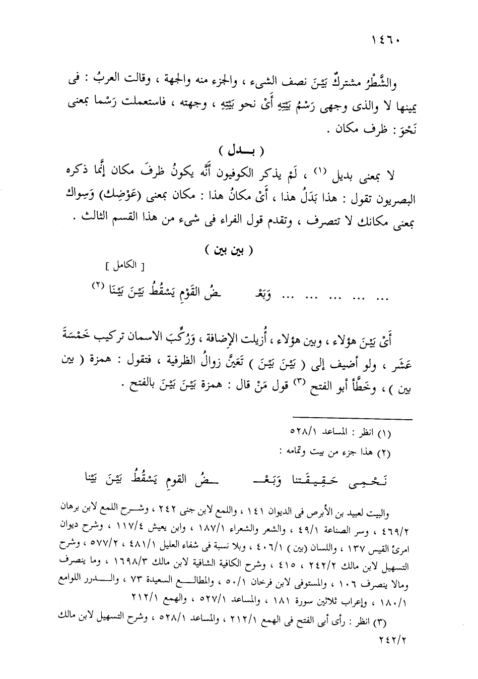 أي بين هؤلاء، وبين هؤلاء، أزيلت الإضافة، وركب الاسمان تركيب خمسة عشر، ولو أضيف على (بين بين) تعين زوال الظرفية، فتقول: همزة (بين بين)، وخطأ أبو الفتح قول من قال: همزة بين بين بالفتح.