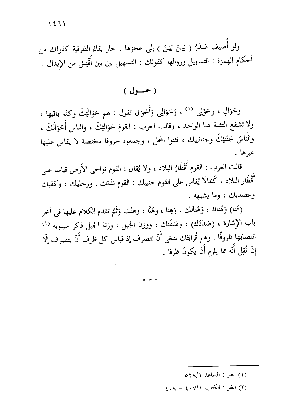 وحوال، وحولى، وحوالي وأحوال تقول: هم حواليك وكذا باقيها، ولا تشفع التثنية هنا الواحد، وقالت العرب: القوم حواليك، والناس أحوالك، والناس جنبيك وجنانبيك، فثنوا المحل، وجمعوه حروفًا مختصة لا يقاس عليها غيرها.