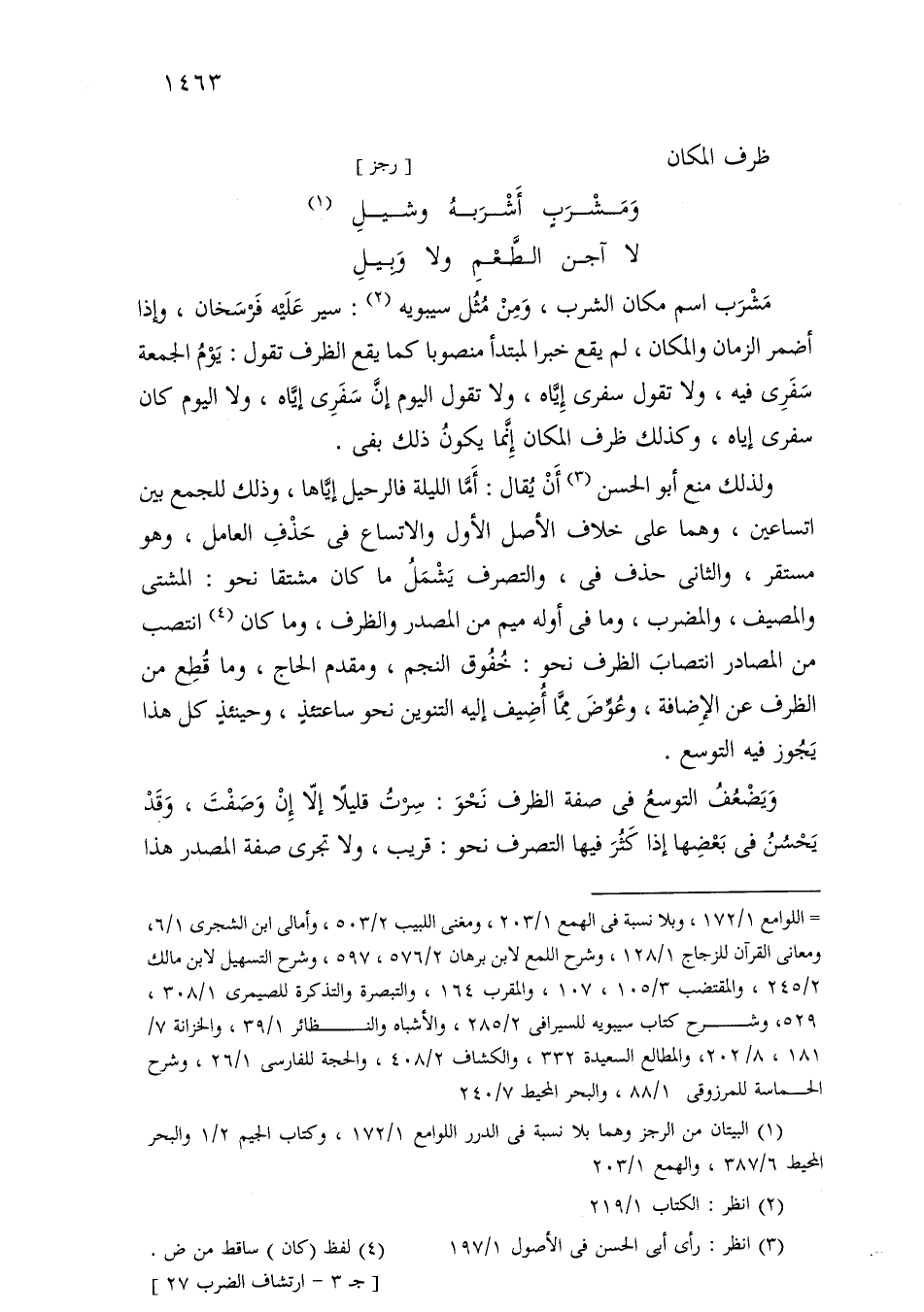 مشرب اسم مكان الشرب، ومن مثل سيبويه: سير عليه فرسخان، وإذا أضمر الزمان والمكان، لم يقع خبرًا لمبتدأ منصوبًا كما يقع الظرف تقول: يوم الجمعة سفري فيه، ولا تقول سفري إياه، ولا تقول اليوم إن سفري إياه، ولا اليوم كان سفري إياه، وكذلك ظرف المكان إنما يكون ذلك بفي.