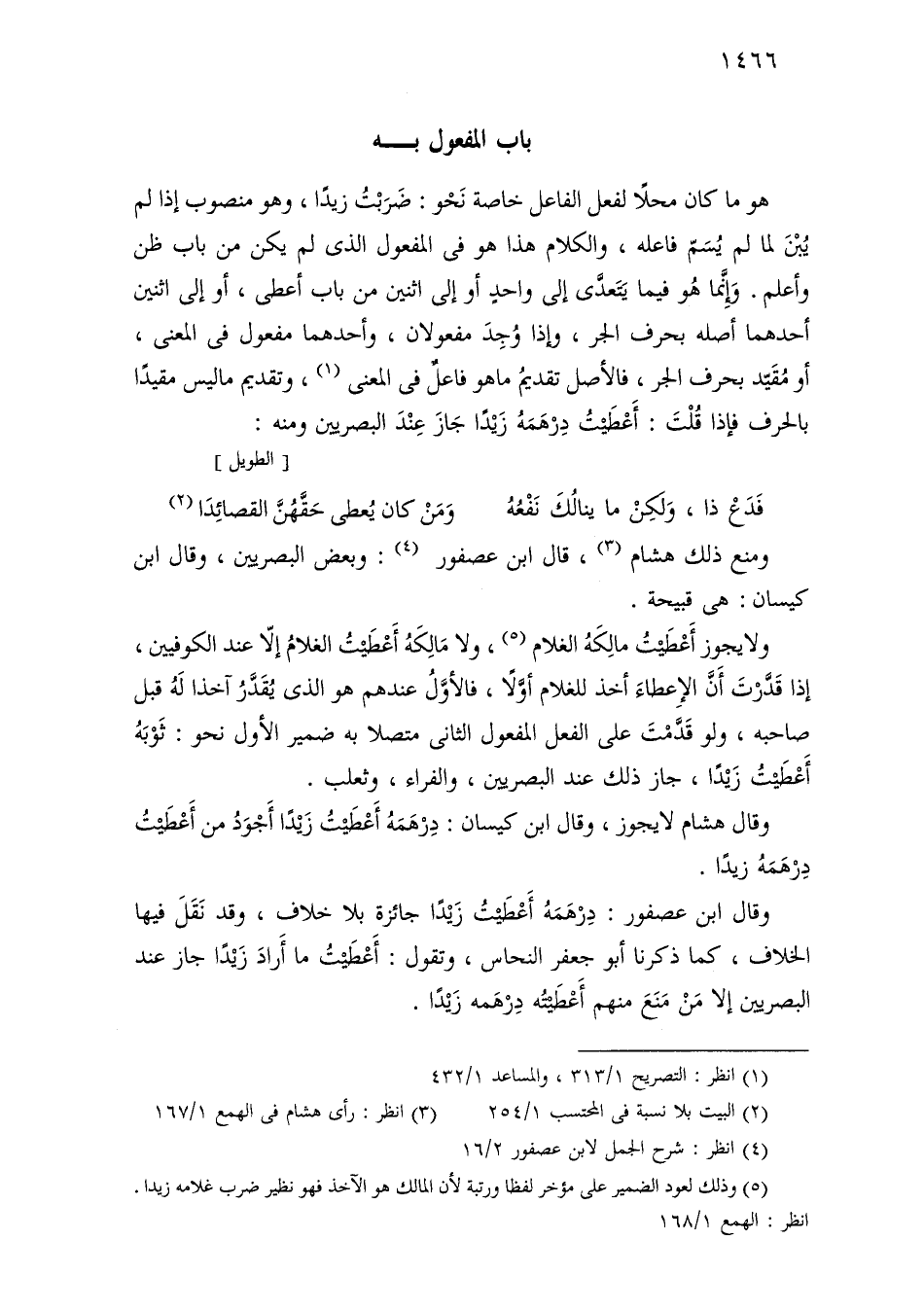 ولا يجوز أعطيت مالكه الغلام، ولا مالكه أعطيت الغلام إلا عند الكوفيين، إذا قدرت أن الإعطاء أخذ للغلام أولاً، فالأول عندهم هو الذي يقدر آخذًا له قبل صاحبه، ولو قدمت على الفعل المفعول الثاني متصلاً به ضمير الأول نحو: ثوبه أعطيت زيدًا، جاز ذلك عند البصريين، والفراء، وثعلب.