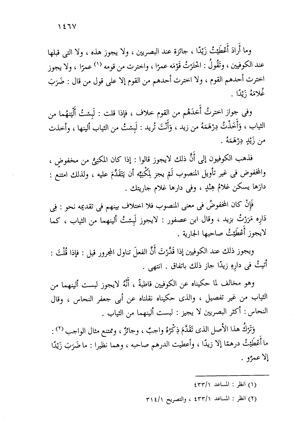 وما أراد أعطيت زيدًا، جائزة عند البصريين، ولا يجوز هذه، ولا التي قبلها عند الكوفيين، وتقول: اخترت قومه عمرًا، واخترت من قومه عمرًا، ولا يجوز اخترت أحدهم القوم، ولا اخترت أحدهم من القوم إلا على قول من قال: ضرب غلامه زيدًا.