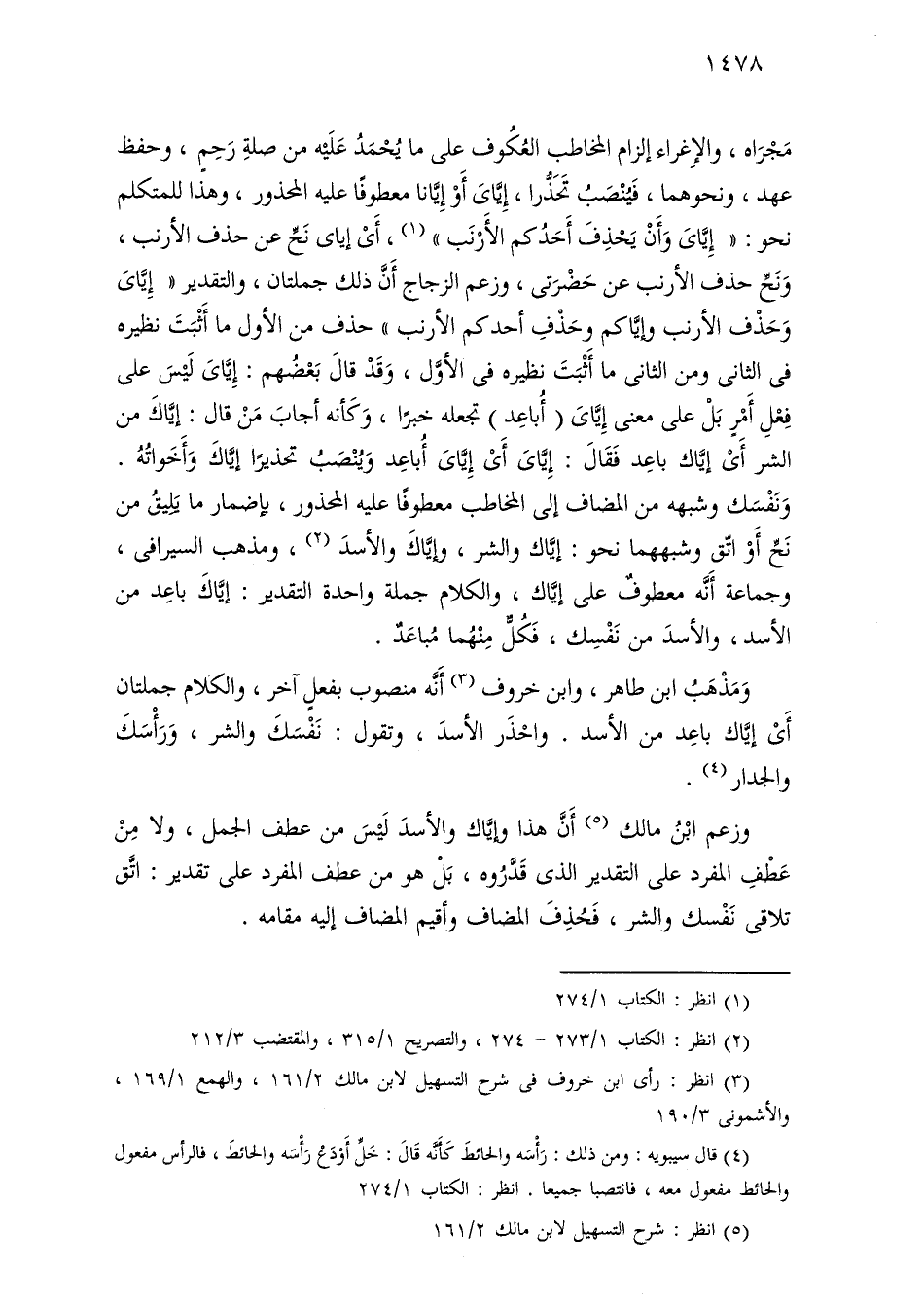 ومذهب ابن طاهر، وابن خروف أنه منصوب بفعل آخر، والكلام جملتان أي إياك باعد من الأسد. واحذر الأسد، وتقول: نفسك والشر، ورأسك والجدار.