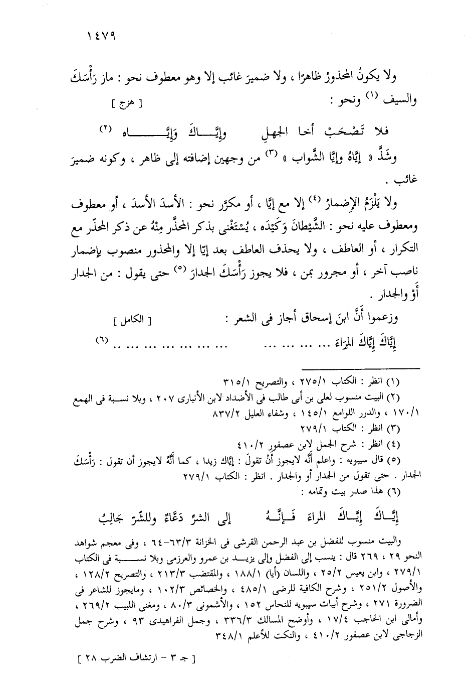 ولا يلزم الإضمار إلا مع إيا، أو مكرر نحو: الأسد الأسد، أو معطوف ومعطوف عليه نحو: الشيطان وكيده، يستغنى بذكر المحذر منه عن ذكر المحذر مع التكرار، أو العاطف، ولا يحذف العاطف بعد إيا إلا والمحذور منصوب بإضمار ناصب آخر، أو مجرور بمن، فلا يجوز رأسك الجدار حتى يقول: من الجدار أو والجدار.