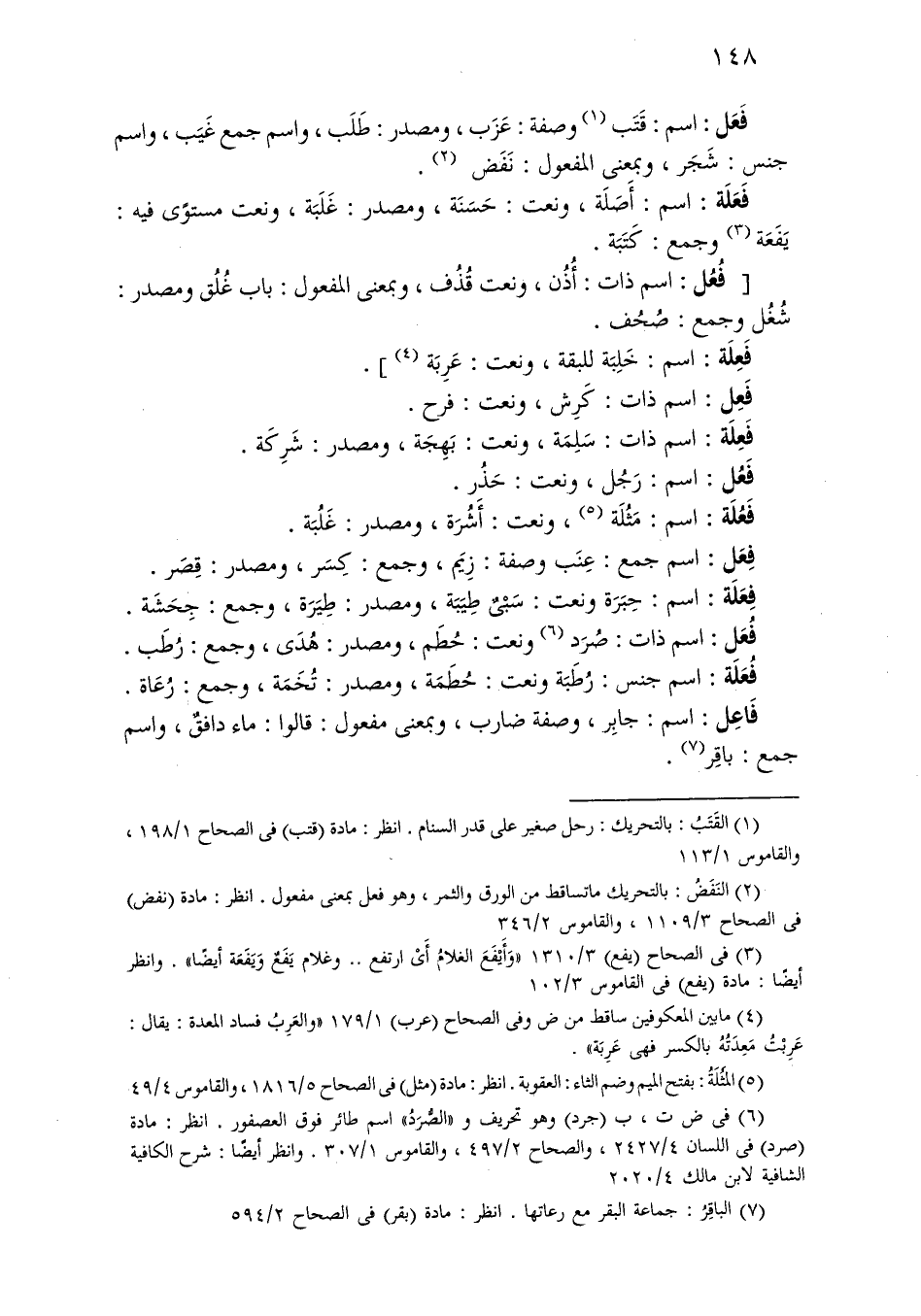 فعل: اسم: قتب وصفة: عزب، ومصدر: طلب، واسم جمع غيب، واسم جنس: شجر، وبمعنى المفعول: نفض.