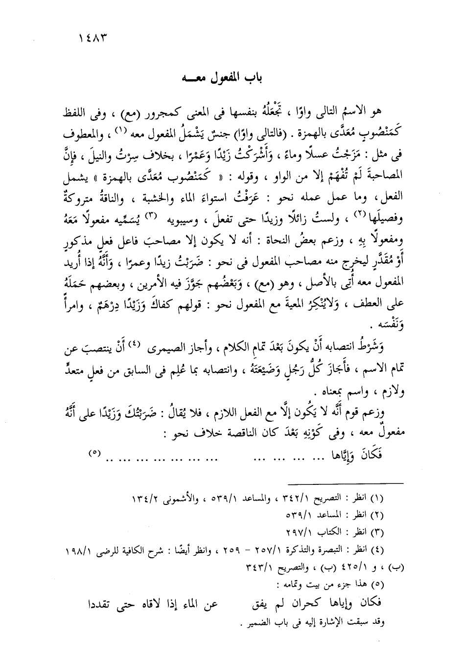 هو الاسم التالي واوًا، تجعله بنفسها في المعنى كمجرور (مع)، وفي اللفظ كمنصوب معدى بالهمزة. (فالتالي واوًا) جنس يشمل المفعول معه، والمعطوف في مثل: مزجت عسلاً وماء، وأشركت زيدًا وعمرًا، بخلاف سرت والنيل، فإن المصاحبة لم تفهم إلا من الواو، وقوله: «كمنصوب معدى بالهمزة» يشمل الفعل، وما عمل عمله نحو: عرفت استواء الماء والخشبة، والناقة متروكة وفصيلها، ولست زائلاً وزيدًا حتى تفعل، وسيبويه يسميه مفعولاً معه ومفعولاً به، وزعم بعض النحاة: أنه لا يكون إلا مصاحب فاعل فعل مذكور أو مقدر ليخرج منه مصاحب المفعول في نحو: ضربت زيدًا وعمرًا، وأنه إذا أريد المفعول معه أتى بالأصل، وهو (مع)، وبعضهم جوز فيه الأمرين، وبعضهم حمله على العطف، ولا ينكر المعية مع المفعول نحو: قولهم كفاك وزيدًا درهم، وامرأ ونفسه.