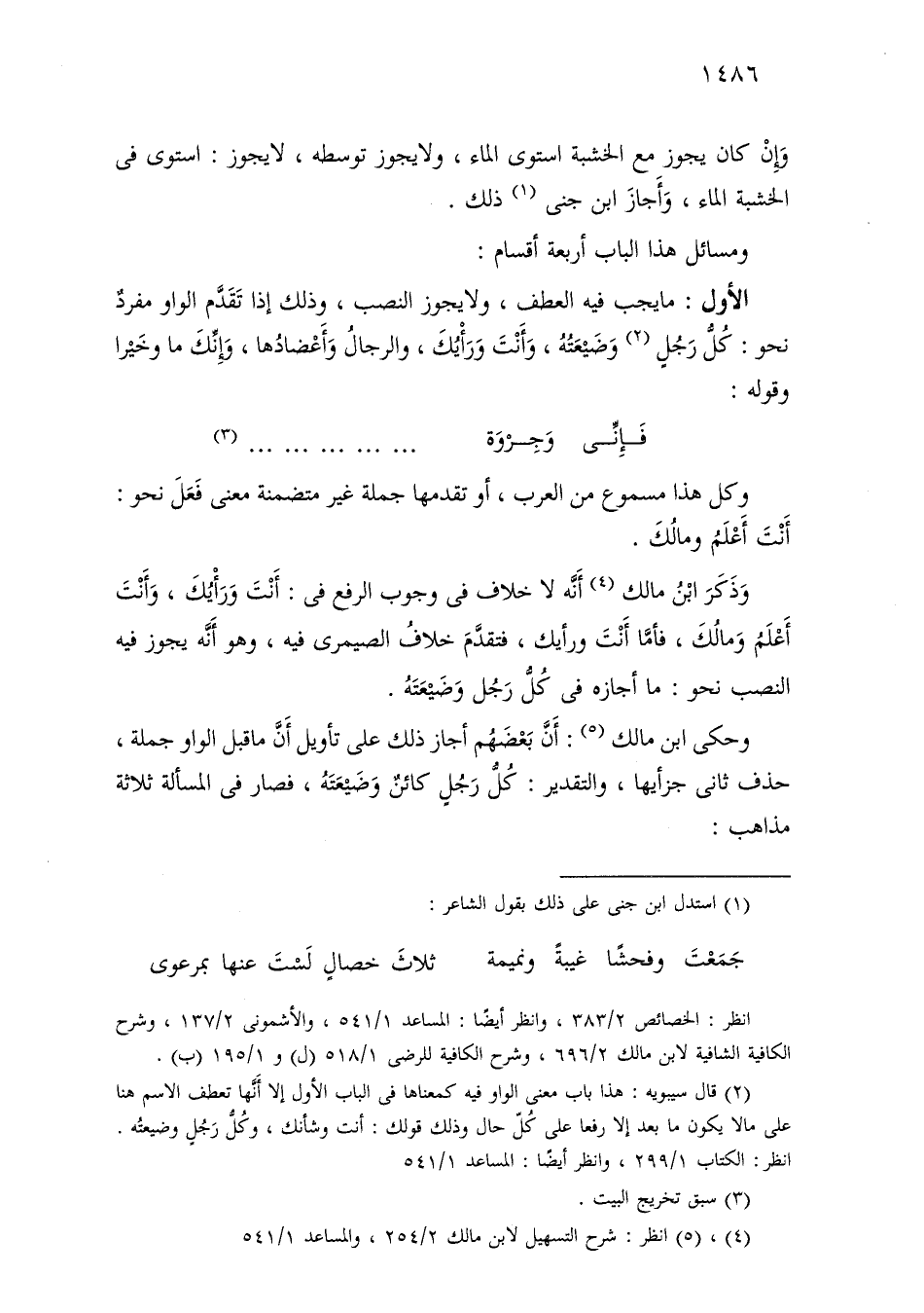 الأول: ما يجب فيه العطف، ولا يجوز النصب، وذلك إذا تقدم الواو مفرد نحو: كل رجل وضيعته، وأنت ورأيك، والرجال وأعضادها، وإنك ما وخيرا وقوله:
