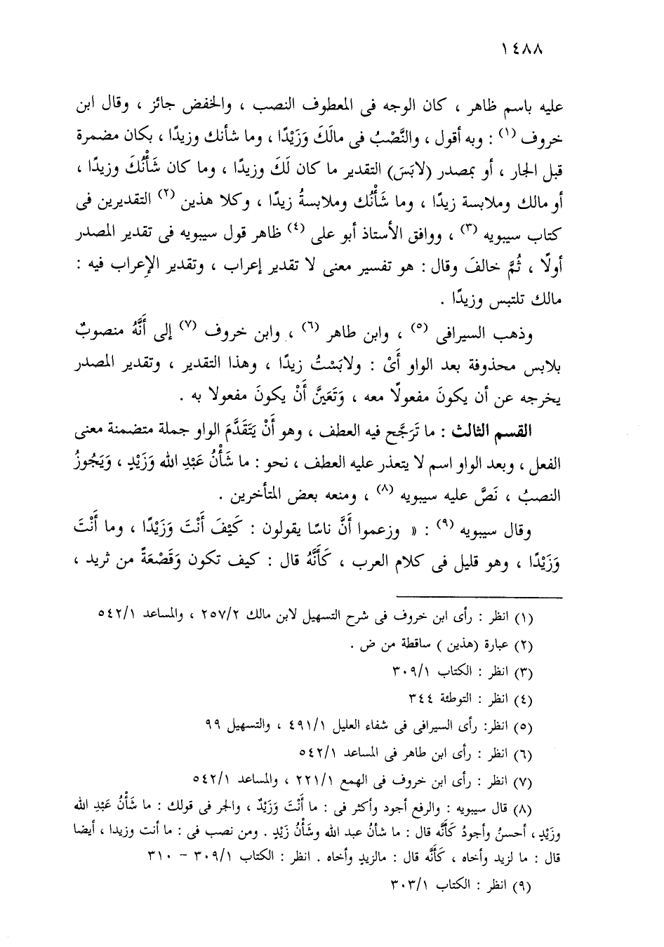 القسم الثالث: ما ترجح فيه العطف، وهو أن يتقدم الواو جملة متضمنة معنى الفعل، وبعد الواو اسم لا يتعذر عليه العطف، نحو: ما شأن عبد الله وزيد، ويجوز النصب، نص عليه سيبويه، ومنعه بعض المتأخرين.